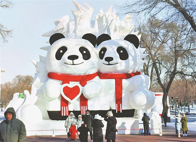 游客与雪博会雪雕合影。