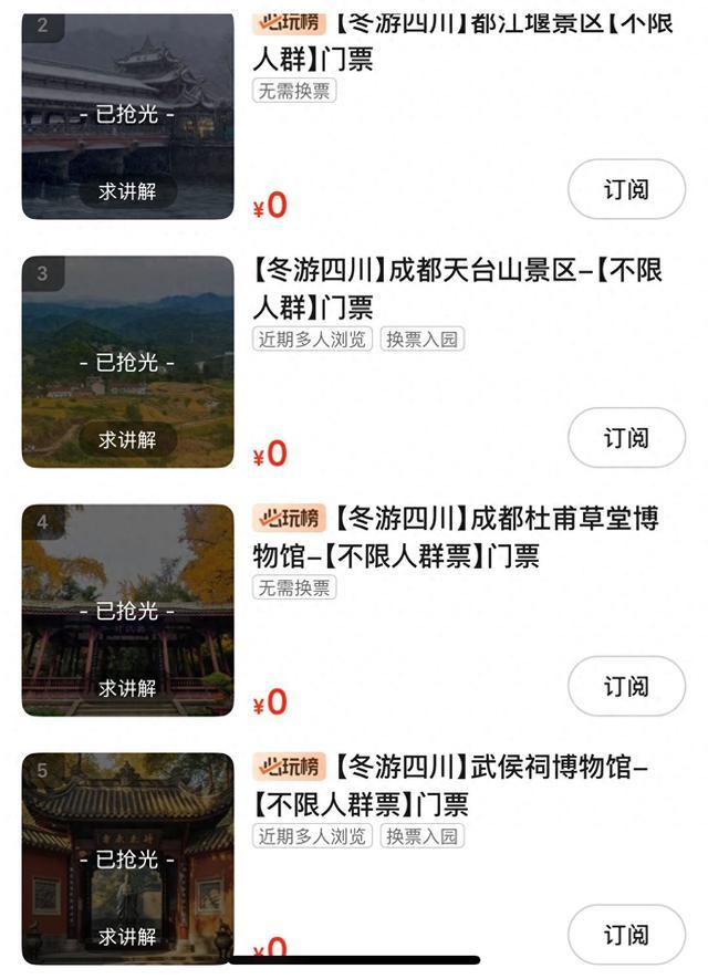 1月5日上午10点整,“冬游四川”10万张景区门票大放送活动准时开启抢票通道。四川观察记者进入活动直播间发现,首批放票期间,直播间吸引超百万人次观看。主播宣布开启抢票后,都江堰、天台山、海螺沟等多个热门景区门票“秒空”,页面相继显示“已抢完”。