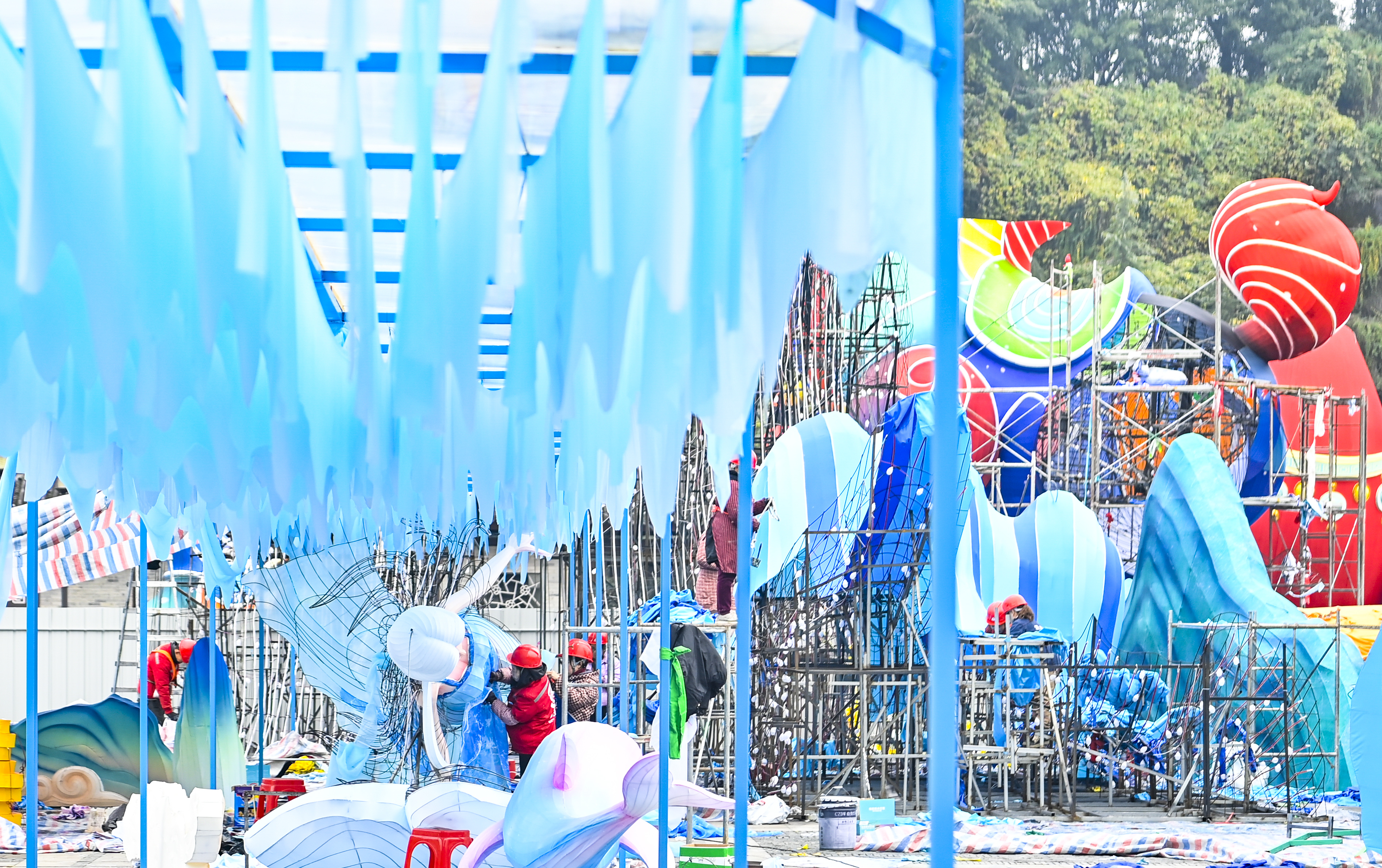 ▲2026年1月5日,两江新区,2026年重庆市新春灯会——“禧欢霓”园博园大型水上灯会建设现场。记者 齐岚森 摄