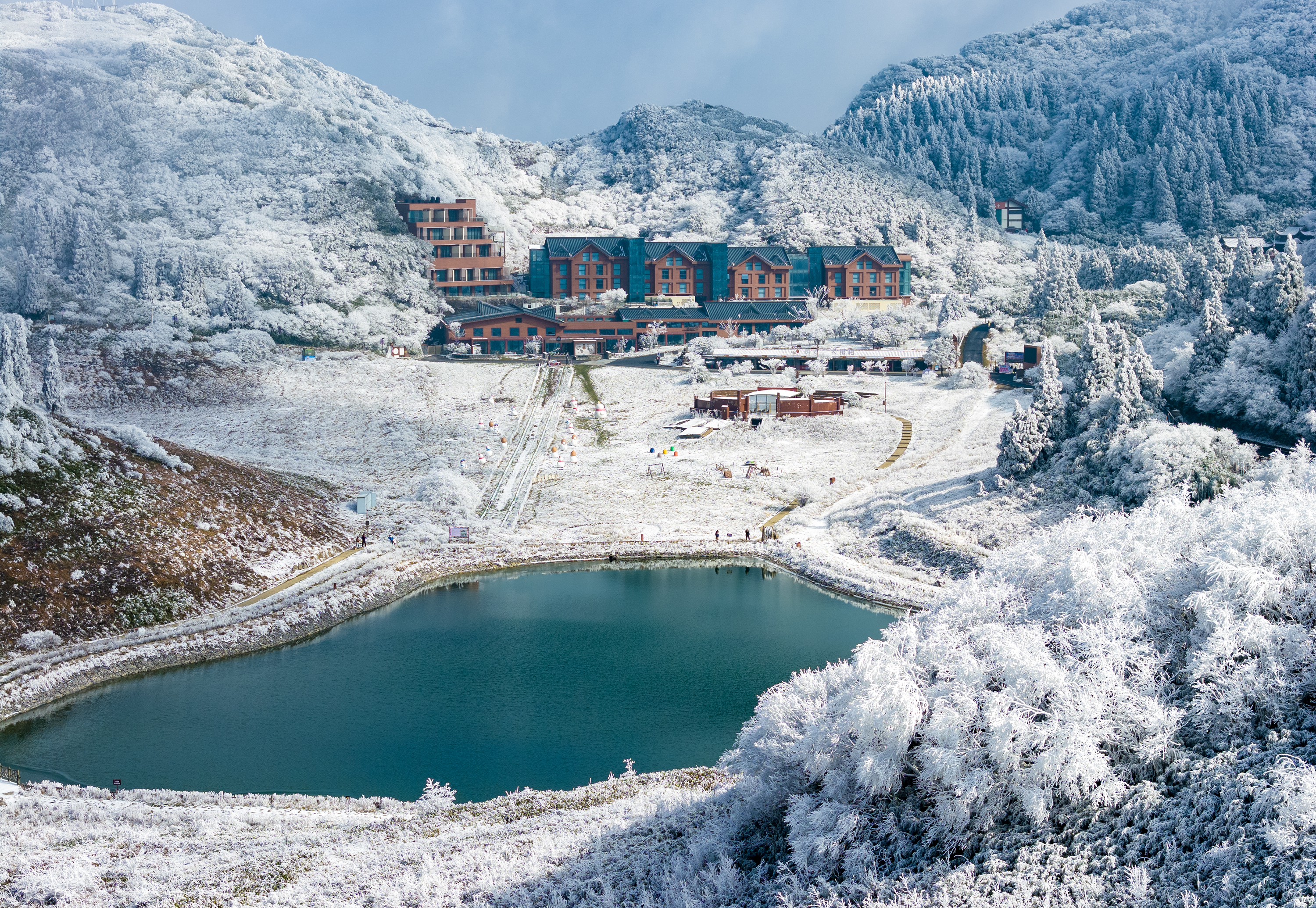 ▲2026年1月6日,南川区金佛山景区雪后放晴,雾凇、树挂、雪山在蓝天白云下如同冰雪童话世界,吸引不少游客来此赏雪游玩(无人机照片)。