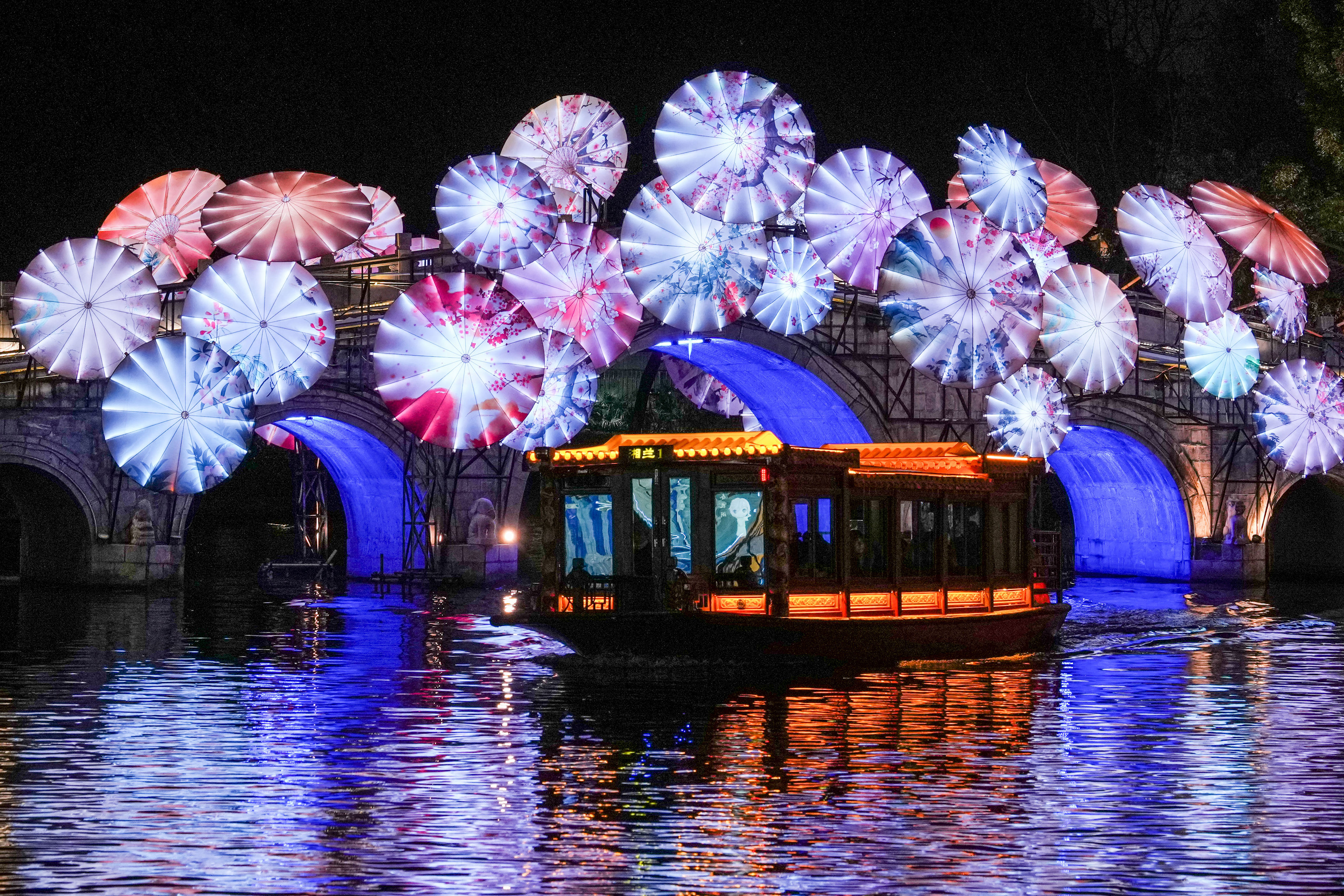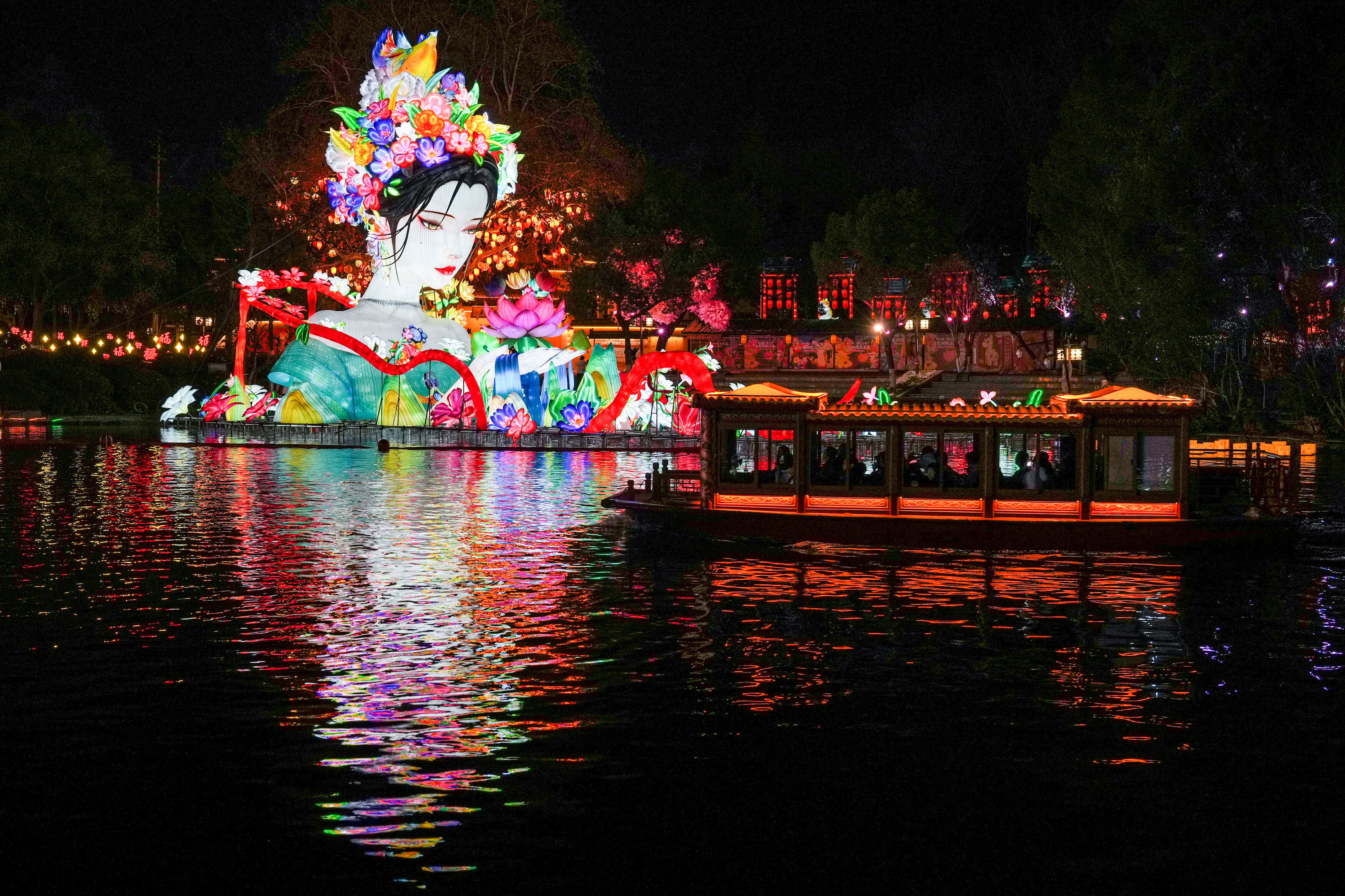 ▲1月21日,观众乘船在第40届秦淮灯会白鹭洲公园展区参观。新华社记者 李博 摄