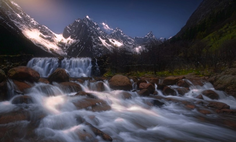 如果说达古冰川是震撼大片,那毕棚沟就是冬日限定的童话插画。云杉和冷杉裹着雾凇,像披银甲的森林卫士,静静守着河谷。阳光穿过林隙,雪粒瞬间化作漂浮的钻石粉尘,随手一拍都是电影感。短短3公里栈道,竟塞进了冰川、温泉、红石滩三种地貌——脚边是冒着热气的温泉,抬头是皑皑雪峰,地理课本里的“垂直自然带”在这里被压缩成一步一景的视觉魔术。晚上住进沟口藏寨,窗外是墨蓝夜色中的雪山剪影,屋内柴火噼啪,酥油茶咕嘟冒香,浪漫值直接拉满。