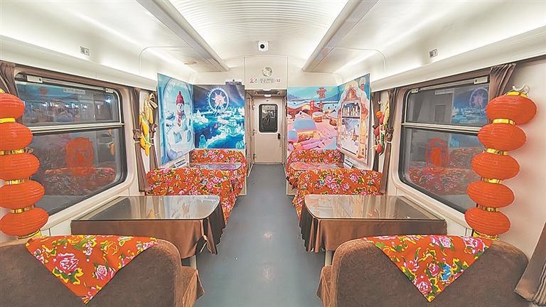 走进主题软卧车厢,扑面而来的是浓浓的东北风情:花布制成的桌布、床旗、枕巾绚丽多彩,边座也套上了同款花布套。房间玻璃窗上贴着精致的剪纸窗花,下铺墙壁甚至贴上了仿砖墙贴纸,营造出东北暖炕的温馨氛围。小桌板上,冻梨、冻柿子、瓜子、花生等东北特色零食琳琅满目,还备有精美的伴手礼袋。走廊悬挂的一串串小灯笼,更添喜庆年味。