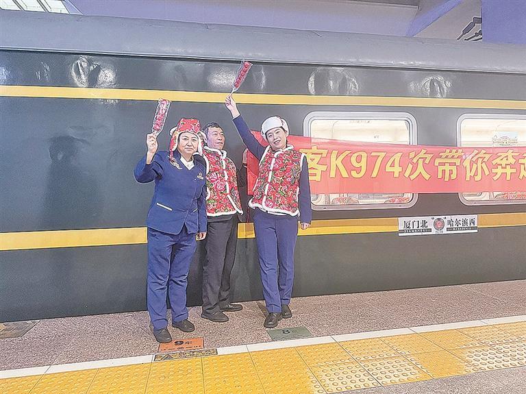 生活报讯 (张海强 记者栾德谦) 近日,厦门北站的站台上,5米长的红色条幅“K974次带你一路向北去冰雪大世界”格外醒目,四位身穿鲜艳东北大花袄的姑娘笑靥如花,音响里循环播放着《东北的冬》等特色歌曲,让人仿佛一秒穿越到千里之外的冰天雪地。