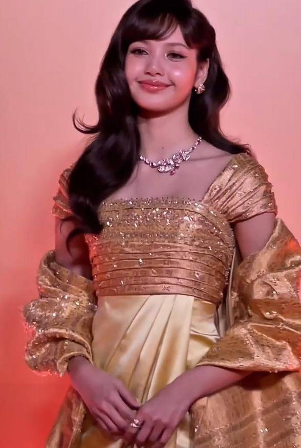 有网友说“Lisa 这造型也太绝了,金色礼服配郑王庙,美到心巴上了”。
