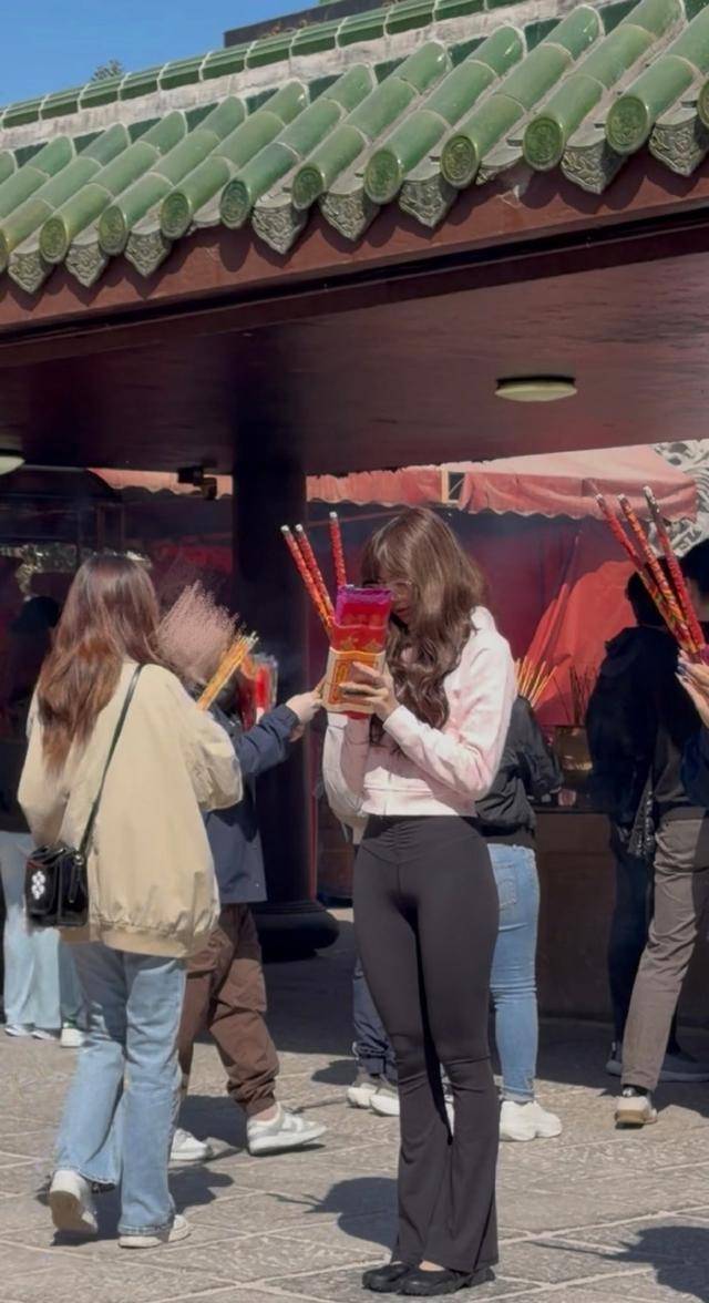 当天是她香港演唱会的首日,上午有路人拍到她穿着粉色卫衣、戴着眼镜素颜出行,混在香客里虔诚祈福,身边没有保镖跟着,被认出来之后还笑着点头回应,特别亲切。