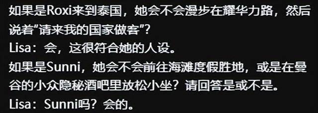 在活动的采访环节,主持人提到很多 Lilies(Lisa 的粉丝)都有提问,还和 Lisa 玩起了关于她五个分身人格角色来泰国旅行会做什么的小游戏。