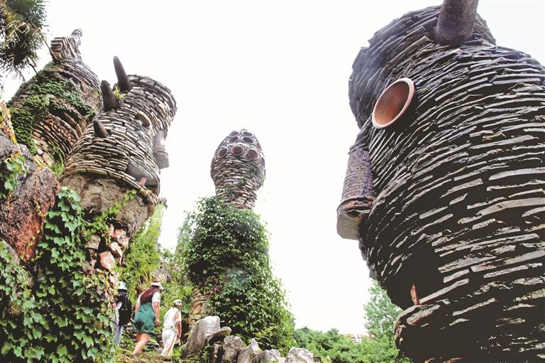 夜郎谷在建设中就地取材,石材、陶罐、木材、废弃建材这些物料成本低廉,除了形制加工外也很少刻意进行艺术加工。这种化腐朽为神奇的方式,既实现了质朴自然的艺术目标又达到了勤俭节约量入为出的经济目标。