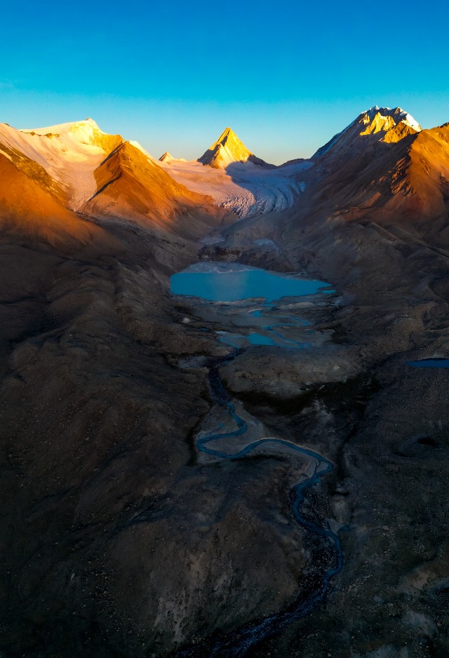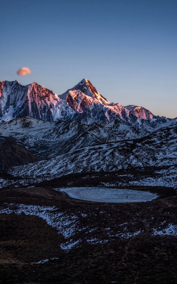 第二天直奔白马林措,1小时车程就到,开启6公里的轻徒步环线。别担心,全程坡度平缓,边走边拍完全不累。库拉岗日群峰就在眼前巍然矗立,湖水更是戏精附体——一会儿蒂芙尼蓝,一会儿翡翠绿,光影一变,调色盘就换了。最绝的是那个“三圣湖同框”机位,雪山倒映湖中,随手一按快门就是壁纸级大片。下午回民宿稍作休整,重点来了:傍晚蹲守日照金山!当夕阳把7538米的主峰染成金红,配上湛蓝天空,那一刻你会懂什么叫“高原限定浪漫”。