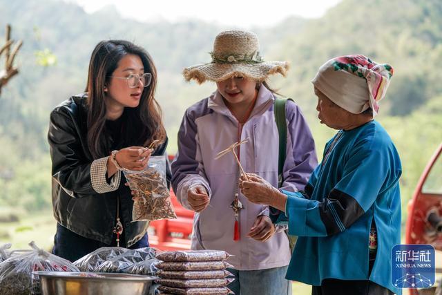 ↑ 3月17日,村民在坝美景区向游客展示当地特产和手工艺品。
