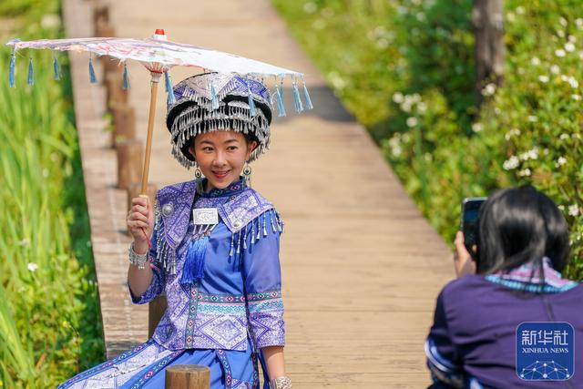 ↑ 3月17日,游客在坝美景区身着少数民族服饰拍照。