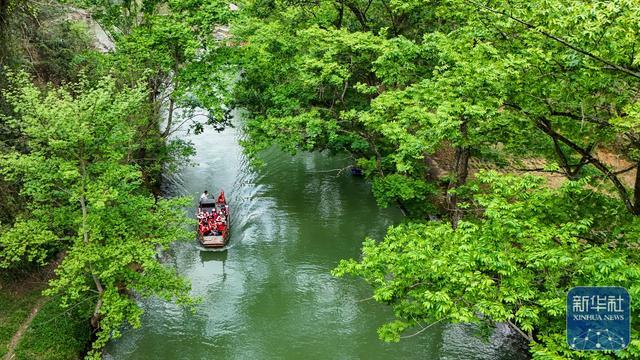↑ 3月17日,游客在坝美景区乘船游览(无人机照片)。