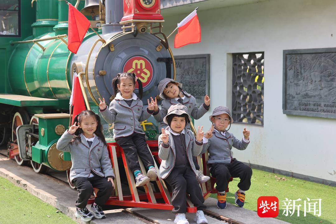 孩子们依次登上小火车,沿着轨道缓缓驶入花田。金黄的油菜花、粉色的海棠、蓝紫色的二月兰从车窗边掠过,水杉林间光影斑驳。车厢里,小朋友们指着外面的花兴奋地喊出声来,几位老师掏出手机帮孩子们拍照。火车经过弯道时,车厢里响起一阵阵笑声。有小朋友形容“像开进了蛋糕里面”,还有的说“这个火车好惊喜,不想下去”。