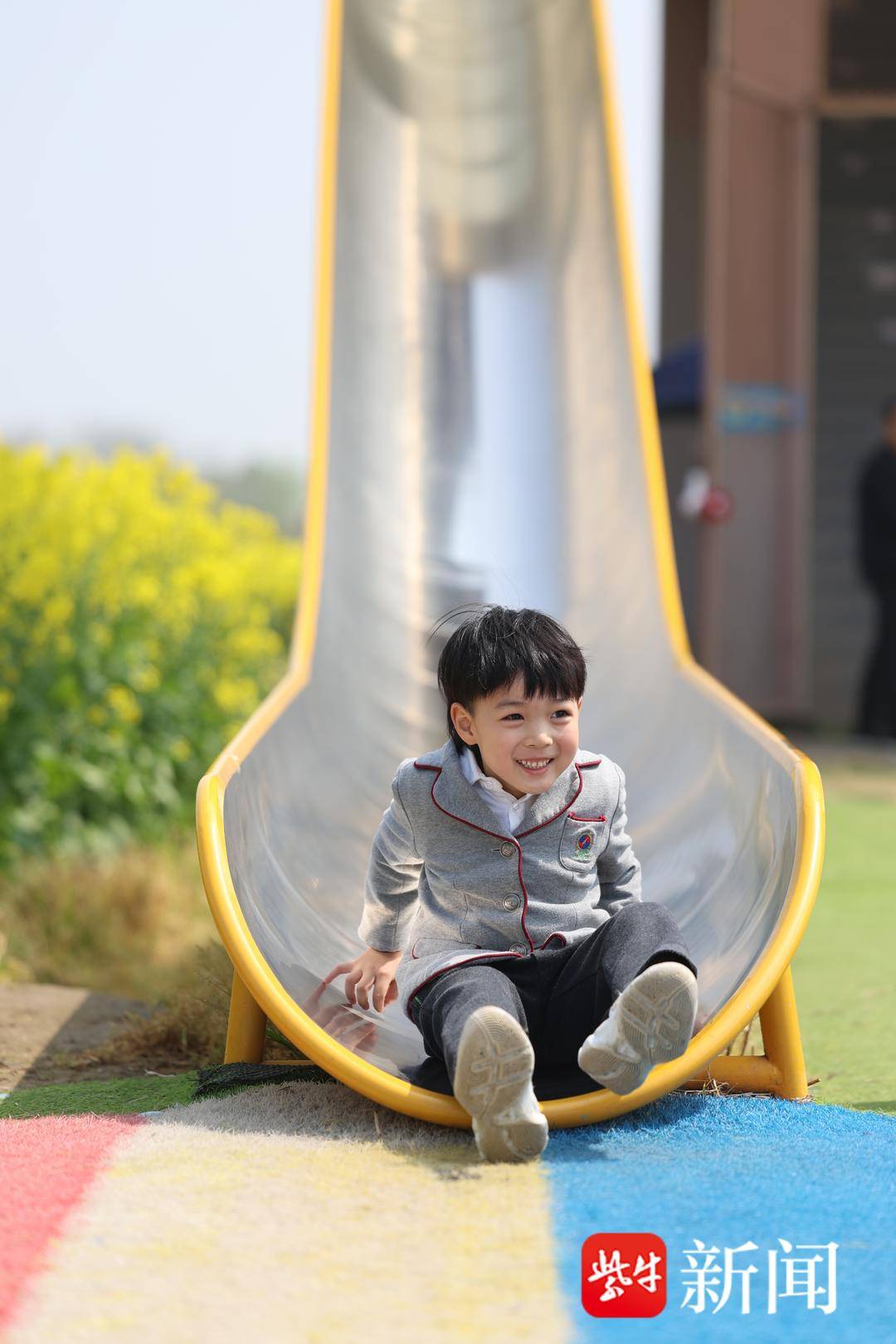小火车停靠后,孩子们来到常北稻麦乐园内的高空滑梯。常北稻麦乐园是常阴沙重点打造的核心景点之一,设有稻田滑梯、观光塔等设施。眼下油菜花盛开,金黄色的花田与橙黄色的滑梯相映成趣,站在观光塔上可以360度俯瞰整片花海。
