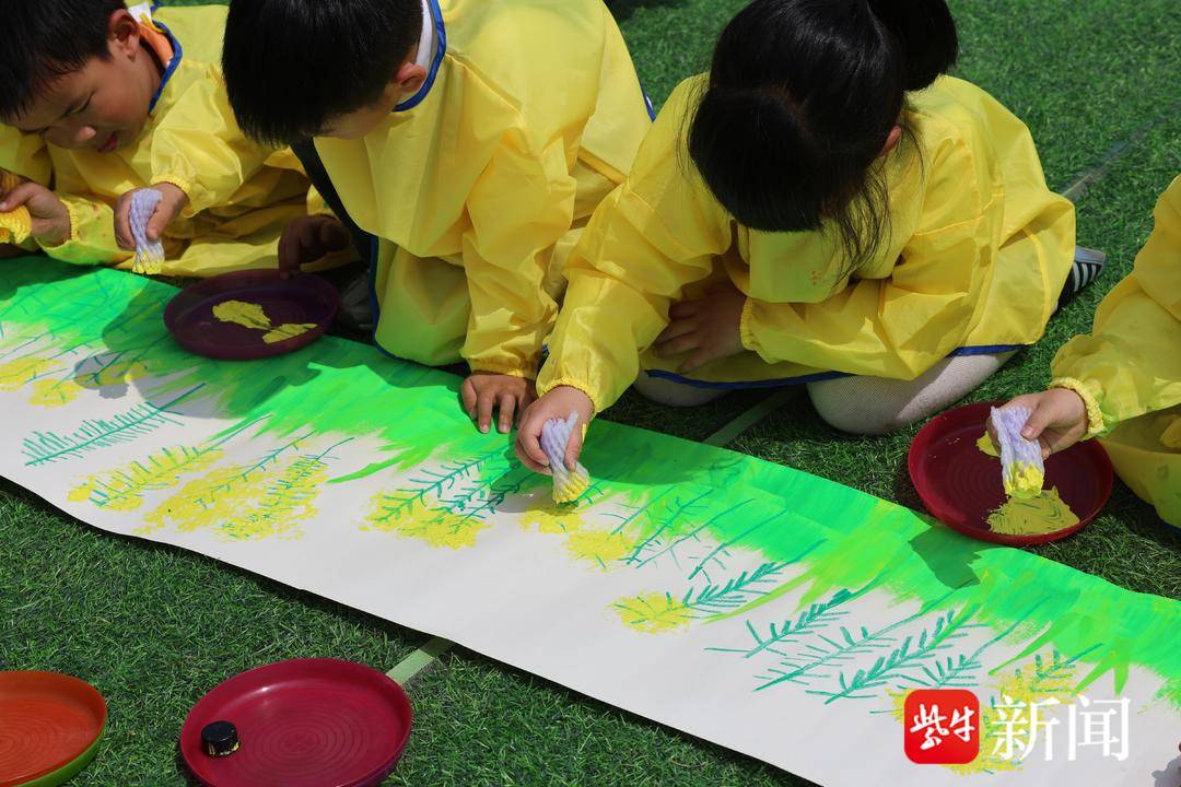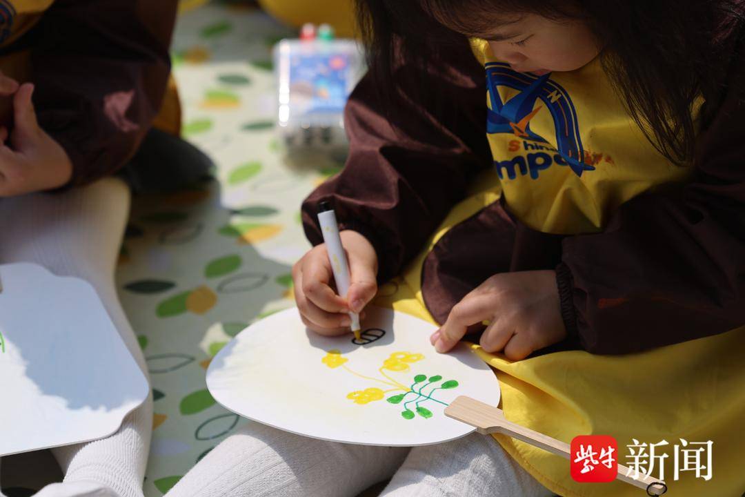 每个小朋友领到油画棒或水彩颜料,趴在软垫上开始画画。有几个小朋友从口袋里掏出放大镜,凑近油菜花仔细观察花瓣的纹路,然后才动笔。写生持续了约二十分钟,花海里安静下来,只听到画笔摩擦纸面的声音。