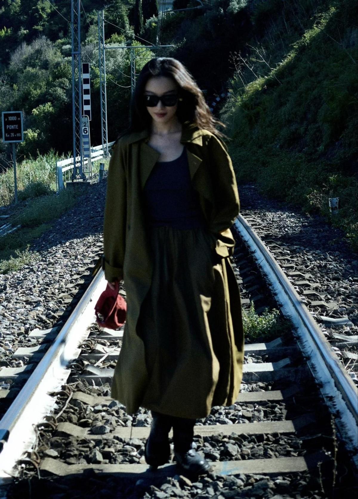军绿色风衣内搭背心,这个组合简直绝了!风衣的硬朗感被背心的随性中和,整个人看起来既帅气又不失女人味,而且倪妮选择了一款oversize版型的风衣,走路带风的气场直接拉满。内搭的背心是修身款,完美展现了身材曲线,这种松紧结合的穿法特别显瘦,秋天气温良好的时候都可以这么穿。