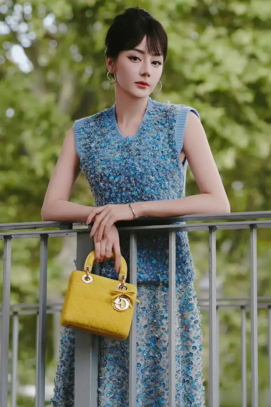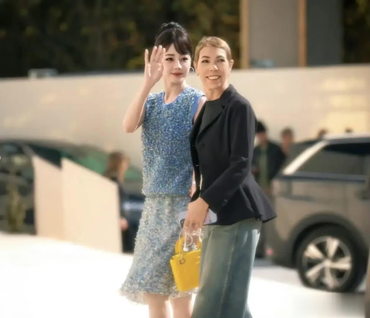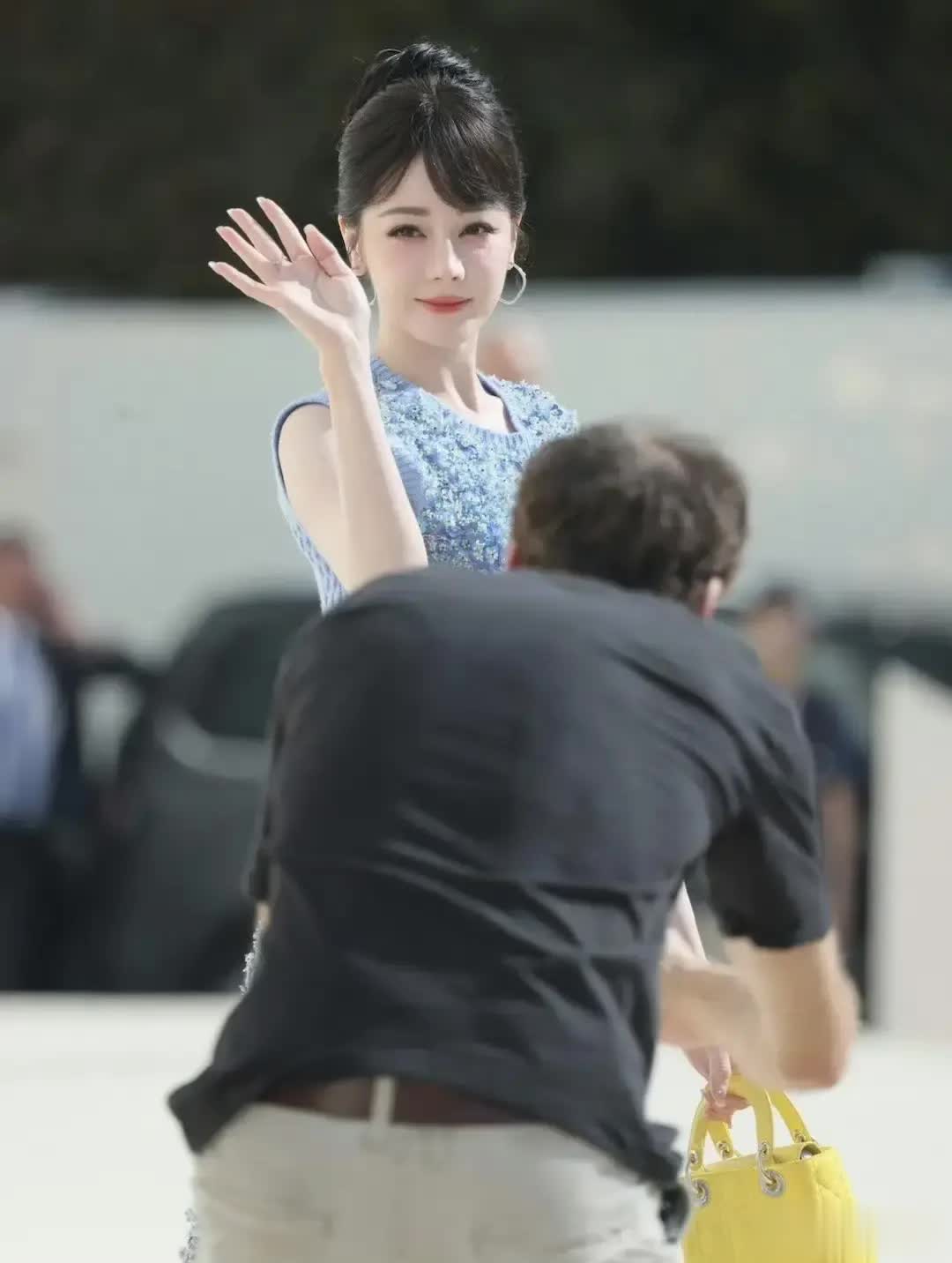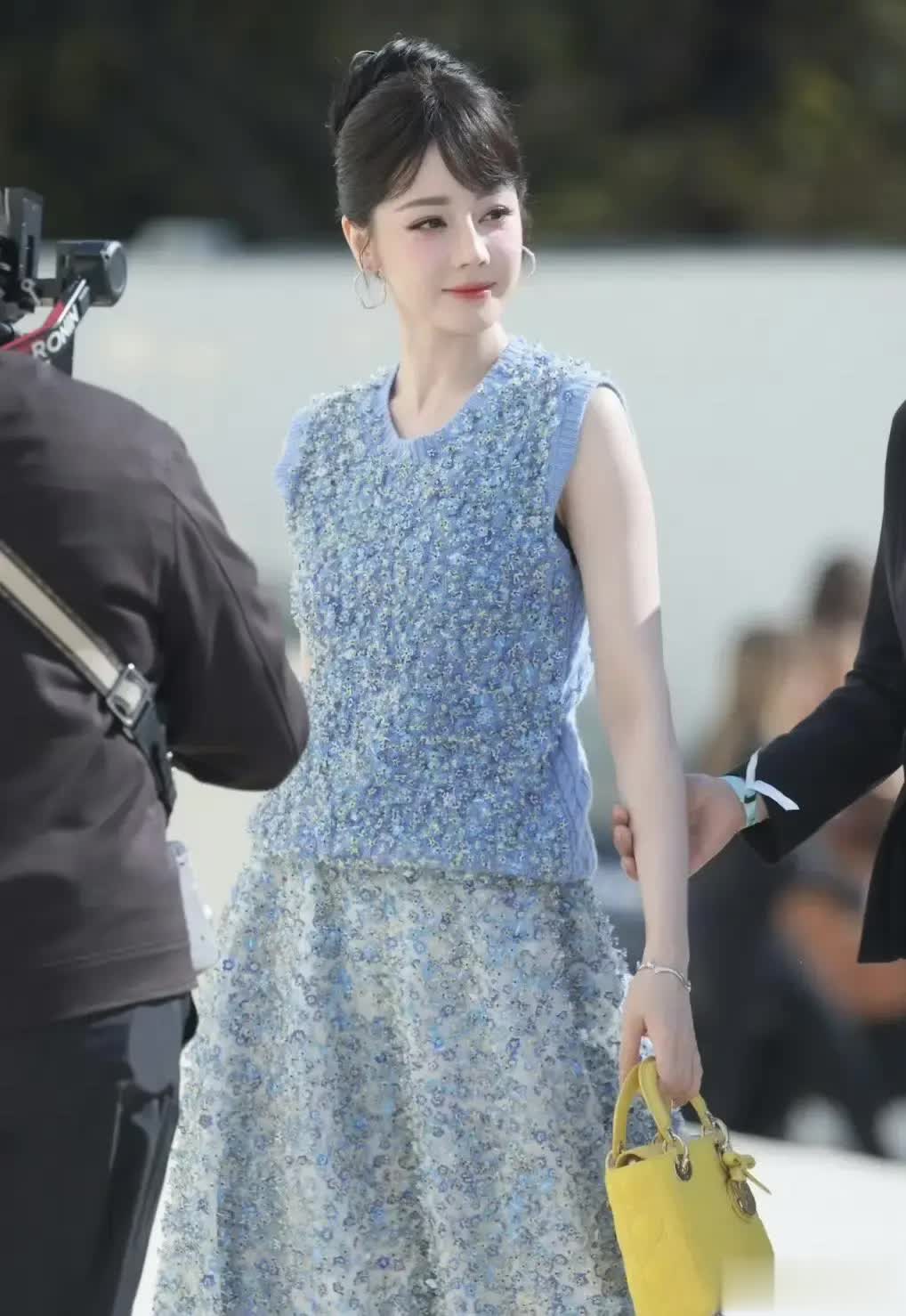 巴黎时装周迪奥2026春夏大秀现场,迪丽热巴作为全球品牌大使身着品牌专为其打造的全球唯一超季特别定制款蓝色无袖花朵套裙惊艳亮相。