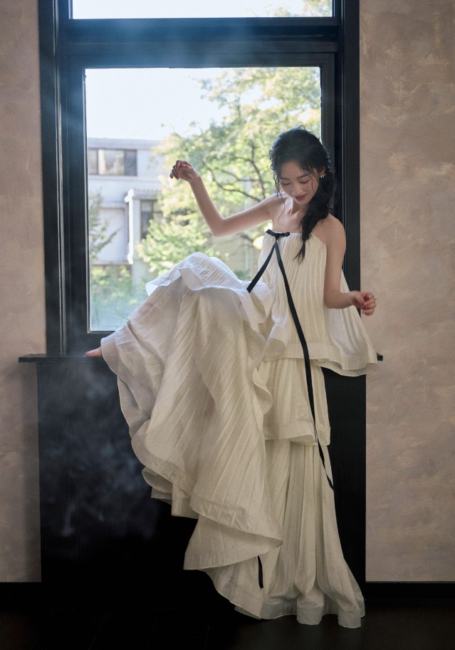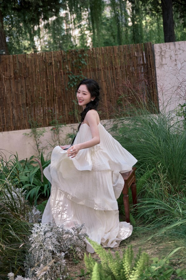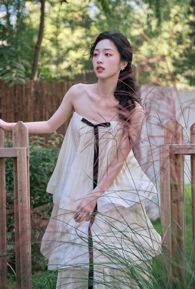 当“氧气感”成为审美趋同下的一股清流,新生代小花邓恩熙用一组森系大片,把这种松弛又治愈的风格具象化。她就像从林间走出的精灵,带着草木的清香,把少女的灵动与高级感糅合得恰到好处。邓恩熙这组造型选择了一件米白色抹胸层叠长裙,自带肌理的面料在光影下泛着柔和的光泽,多层褶皱设计像被风吹动的涟漪,行走间尽是轻盈感。黑色蝴蝶结与飘带的点缀,是甜而不腻的点睛之笔:既保留了少女的俏皮,又用撞色为造型注入一丝小众设计感。