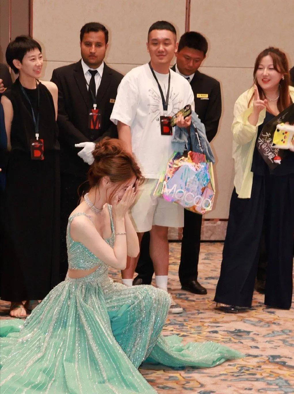 记得前一段时间,杨颖在澳门出现,穿着一身绿色的晚礼服,半跪在地和粉丝们合影。