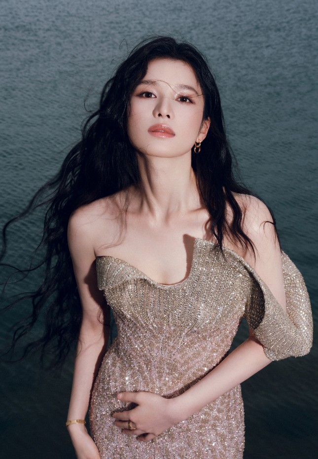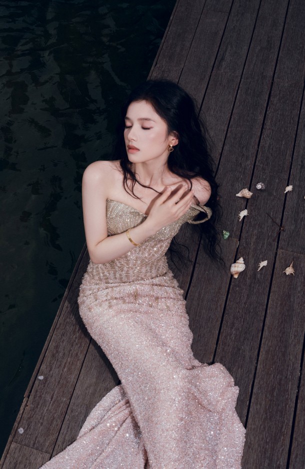 当张婧仪躺在临水的木质栈道上,被细碎的贝壳环绕时,镜头里的画面像从深海童话里截下的一帧:玫瑰粉香槟色的鱼尾裙裹着她的身形,裙摆如人鱼尾鳍般铺展在木板上,满身碎钻随光影流转,是揉碎了的星光落进了裙摆。这袭礼服的设计太懂“氛围杀”:上半身是香槟金的亮片交织出的光泽感,下裙渐变为柔雾玫瑰粉,一字肩的褶皱像海浪轻拍肩颈,鱼尾廓形顺着腰线向下收拢又散开,既衬出她肩颈的线条,又添了几分慵懒的柔媚。她垂眼时,黑发落在臂弯,耳饰的金环与腕间细镯相呼应,连指尖的弧度都裹着松弛的氛围感。