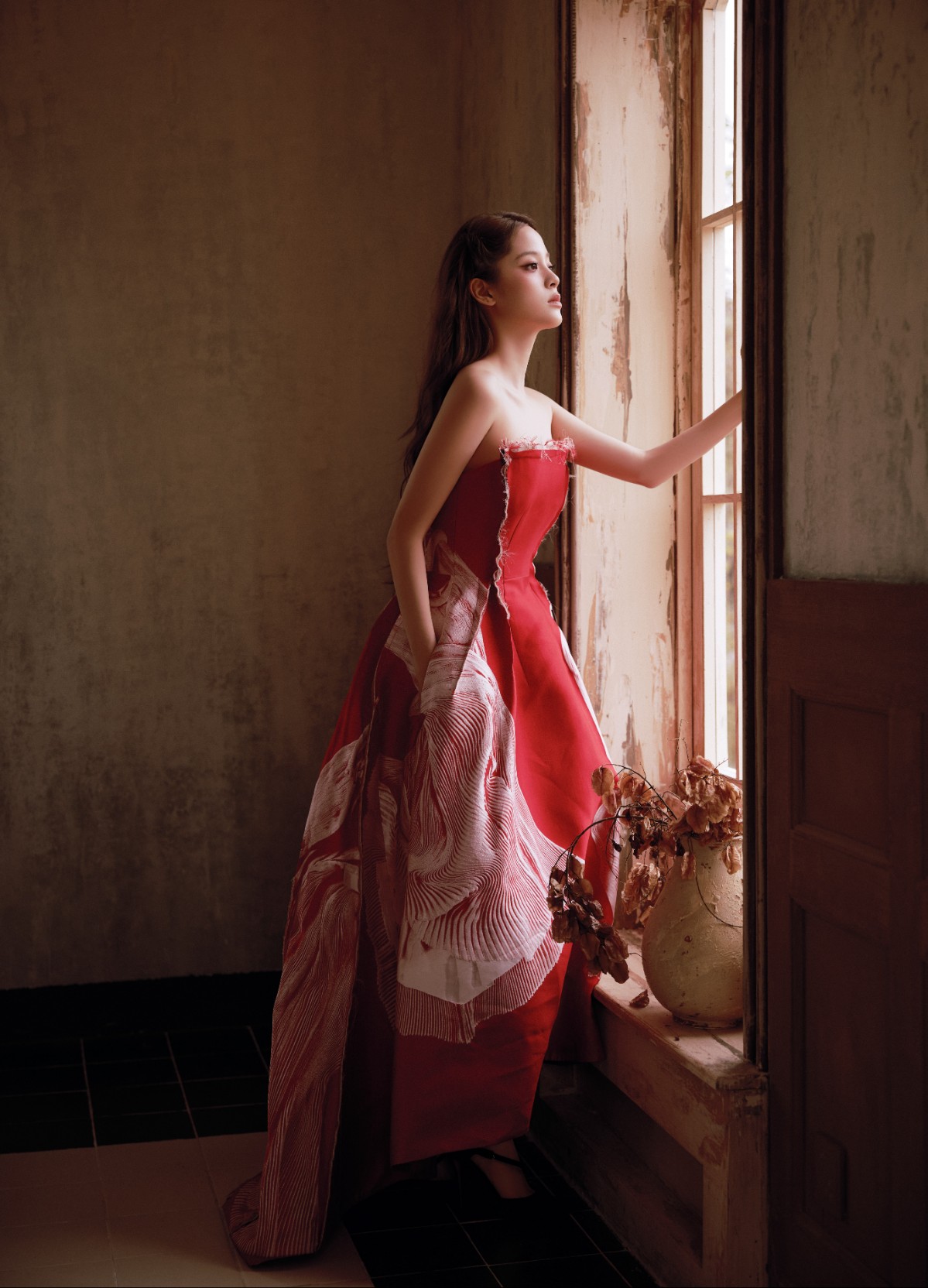 一袭红裙更是设计感十足,抹胸款式衬得肩颈线条愈发优越,裙摆处的白色纹理如艺术笔触般肆意铺陈,在红色的热烈中注入了几分雅致的艺术感。当她或静坐于大提琴盒旁,或立于旧窗棂前,红裙的曳地裙摆与复古空间的斑驳墙面形成强烈视觉冲击,却又因妆容的柔和而达成奇妙的平衡,恰如她在艺术与时尚领域的探索——以大提琴手的身份深耕音乐,又以时尚icon的姿态诠释风格,在传统与现代、艺术与潮流的边界自由游走。