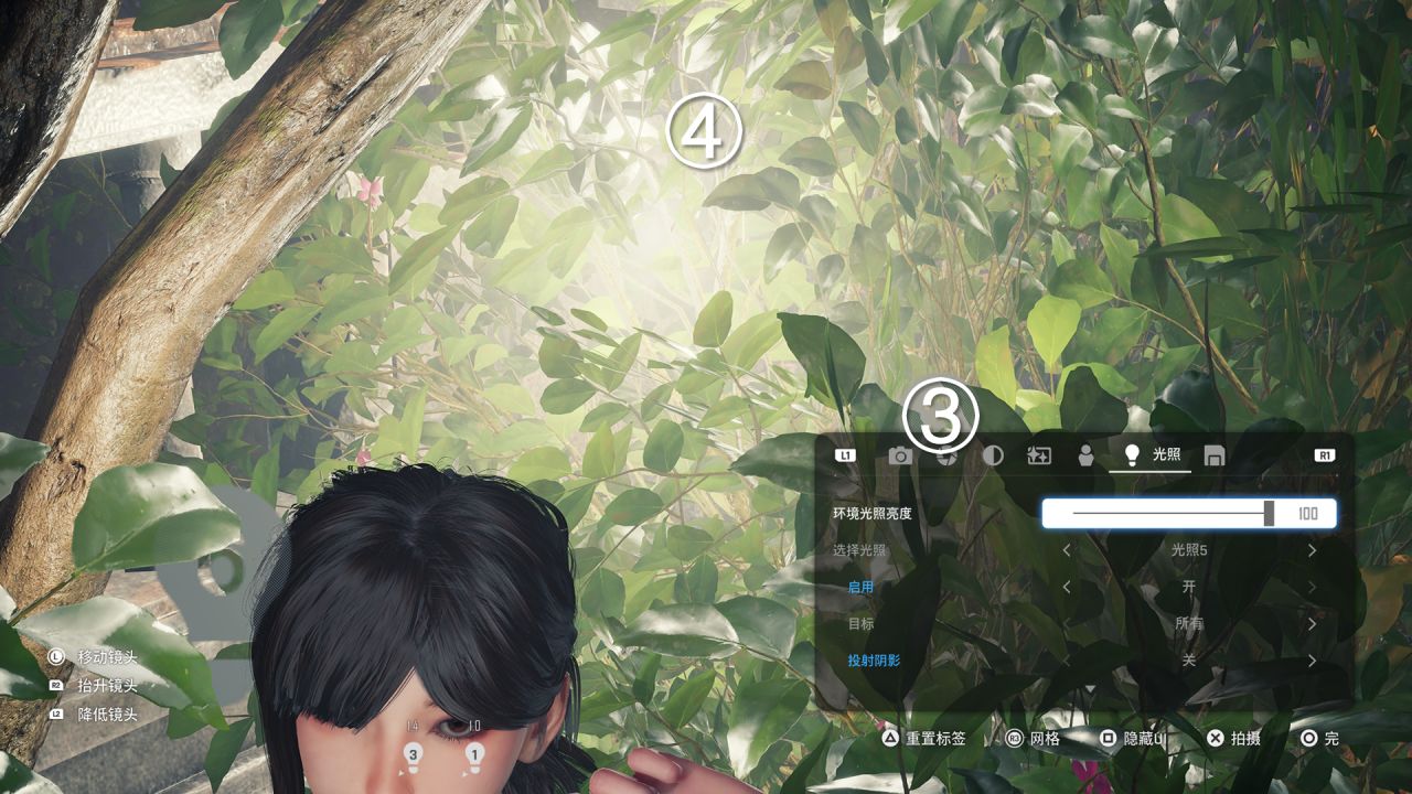 核心:光④在稍远处拉到最大强度,同时拉高散射,模拟树林边界的过曝,光③打亮周围的树叶,造出叶子的高亮的反光,这两个光的阴影均关闭来模拟自然的阳光质感;