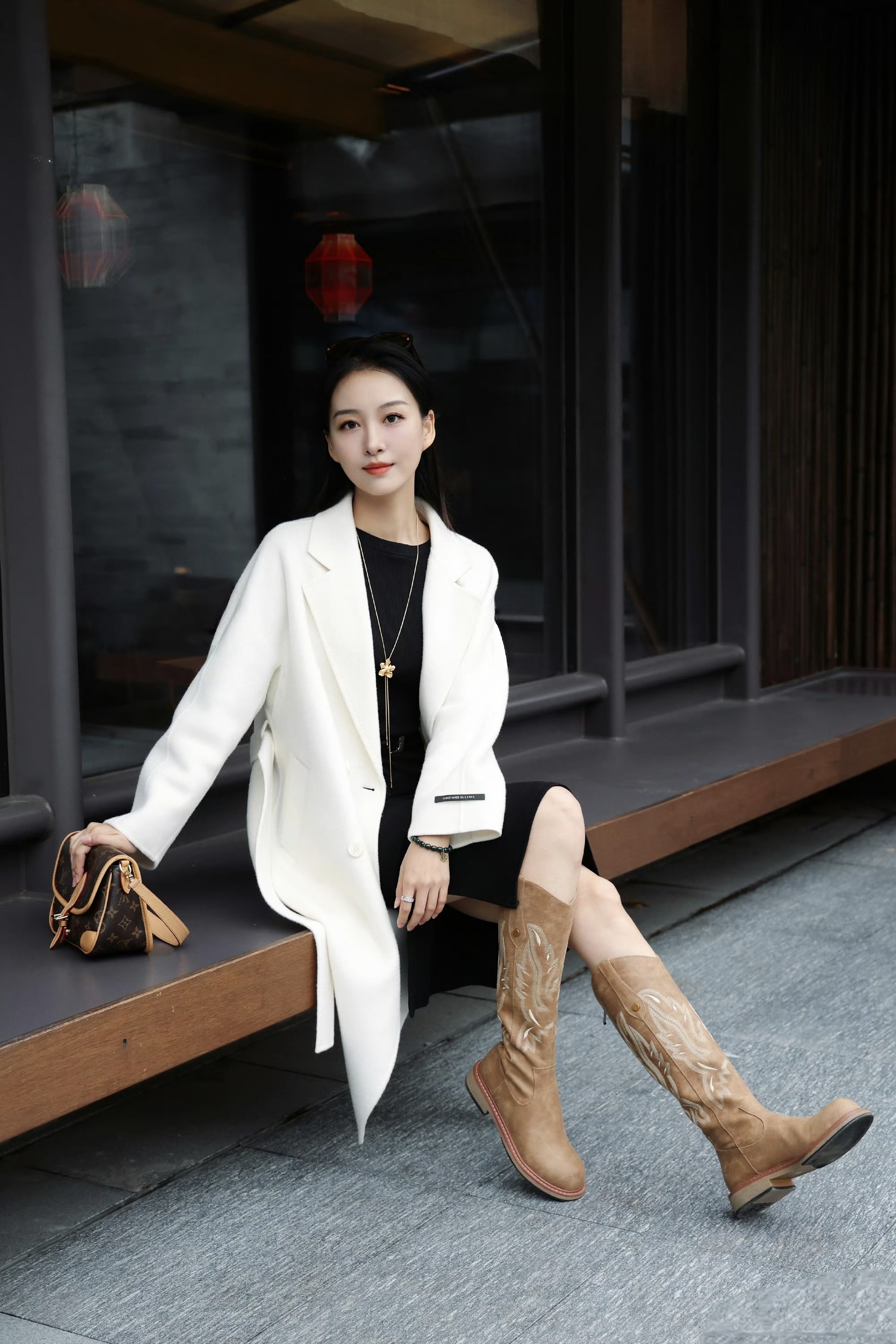 刘璇的穿搭,是一场经典配色的优雅独奏。纯净的白色大衣如冬日初雪,裹挟着温柔的气场,将她衬得愈发清丽。内搭的黑色连衣裙则是永不过时的底色,简约的剪裁勾勒出温婉的轮廓,黑与白的碰撞,是时尚界亘古不变的经典,在她身上却焕发出别样的雅致。那一条金色的长链项链,如灵动的音符坠于胸前,为整体造型增添了精致的质感;黑色腰带巧妙收束腰线,让宽松的大衣多了几分利落;而那双带有刺绣的棕色长靴,则像是从西部电影里走来的符号,为这份优雅注入了一丝不羁的个性,传统与现代、优雅与率性,在她的穿搭里达成了奇妙的平衡。