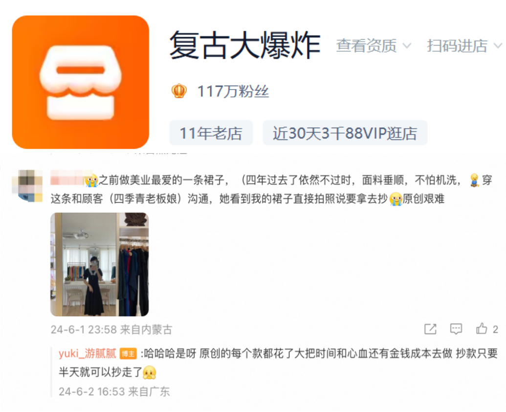 正如2024年,坐拥117万粉丝、11年老店的复古大爆炸宣布闭店,创始人提及行业内抄袭乱象。即使推出高质量单品,但市场其他竞争者下意识抄袭打版,让部分优秀品牌陷入困境。