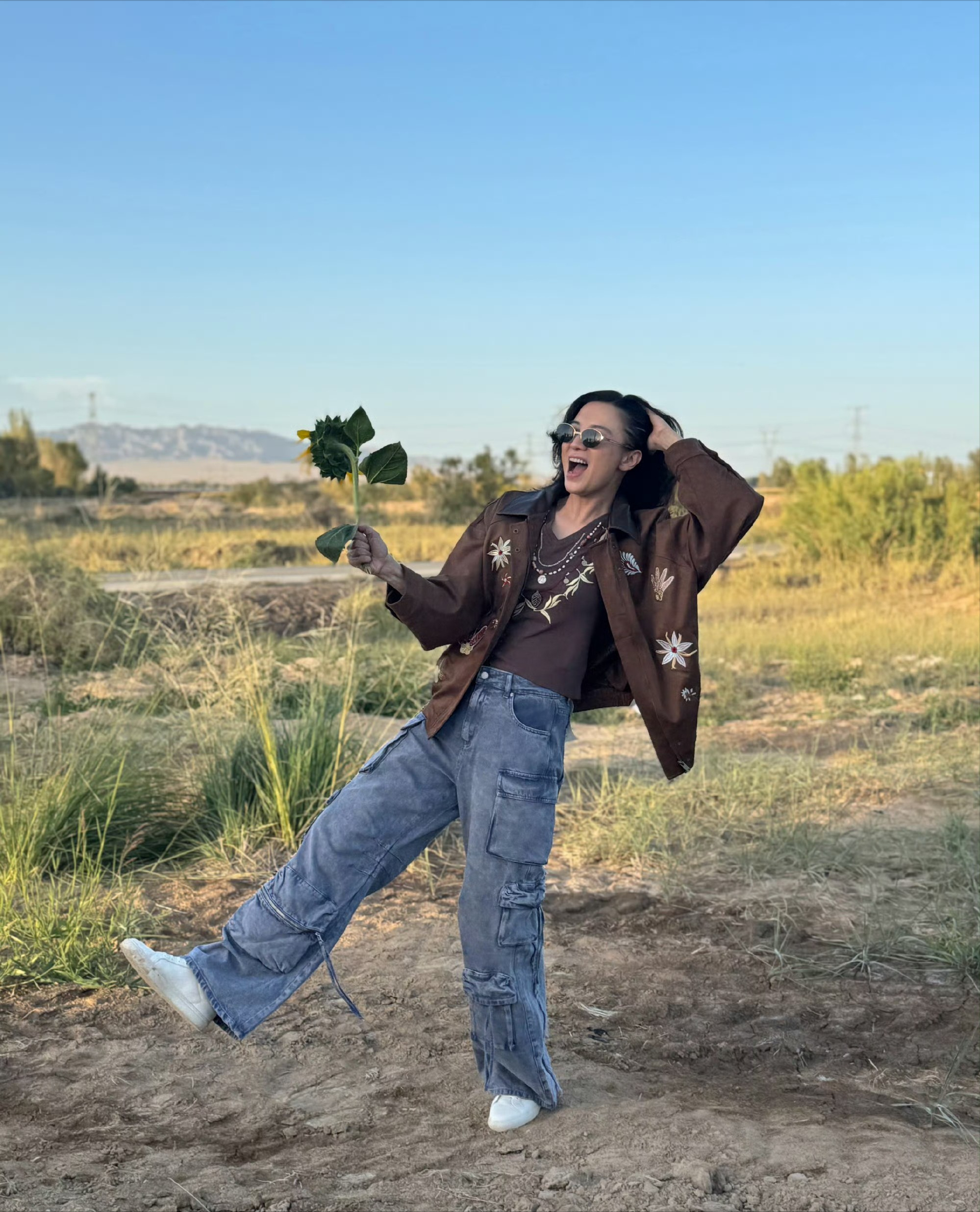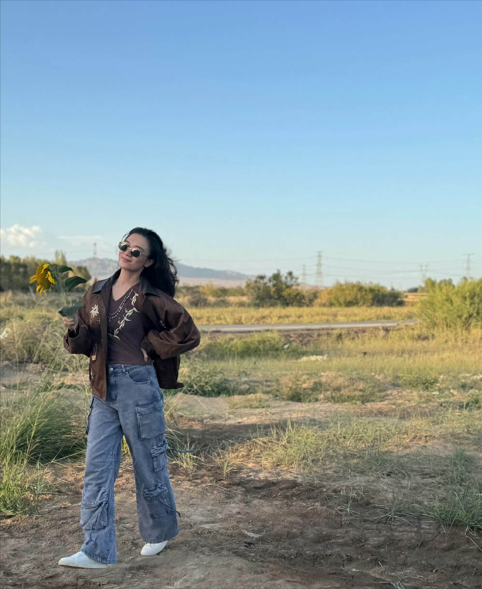 慵懒的大波浪发型,配上棕色的短外套,很有个性的穿着打扮。不过,对纯色有些审美疲劳的她,选择的是有刺绣的上衣。