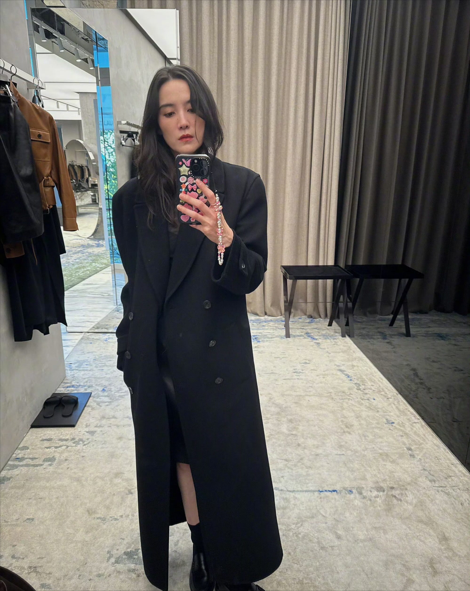 或者,你也可以和她一样选择这件超长款式的黑色呢子,一定要是那种快要到脚面的长度,将整个身体包裹在里面,将自己身材遮蔽起来,留有一定的神秘感。