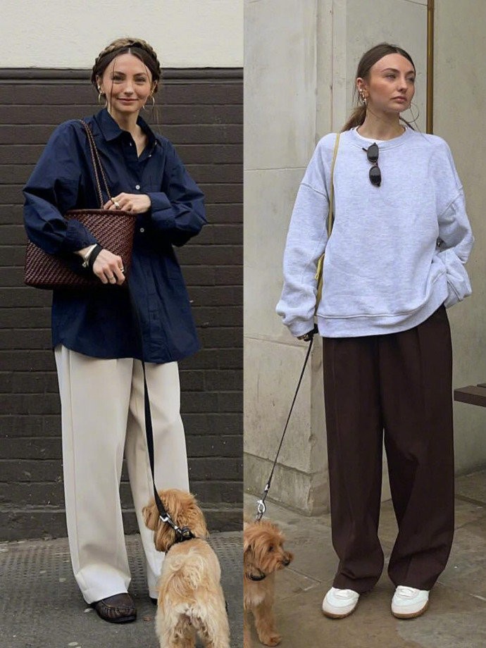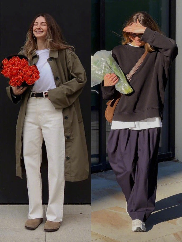 在比例优化上,Chloe Hayward 的技巧简单又好操作,156 小个子跟着学几乎不会出错。她最常用的是 “上短下长 + 同色系延伸” 的组合,比如浅棕色短款针织开衫内搭白色短 T 恤,下身搭配深棕色高腰直筒裤,脚上穿一双同色系的短靴,整套造型用同色系串联,没有明显的色彩分割,再加上 “上短下长” 的版型搭配,视觉上能让腿长至少显长 5 厘米;面对容易显臃肿的宽松单品时,她会用 “细腰带 + 露脚踝” 的方式来调整,比如穿宽松的长款衬衫时,在腰间系一条细巧的皮质腰带,轻轻勒出腰线,再搭配短裤打造 “下衣失踪” 的效果,脚下穿一双浅口单鞋露出脚踝,既保留了衬衫的慵懒感,又不会让宽松的版型显得拖沓;她还很擅长用 “鞋款延伸腿部线条”,156 身高的她很少穿笨重的厚底鞋,反而偏爱裸色浅口单鞋、黑色细跟短靴,这些鞋款要么能和肤色衔接,要么能露出脚踝,从视觉上延长腿部线条,让整体比例更协调。