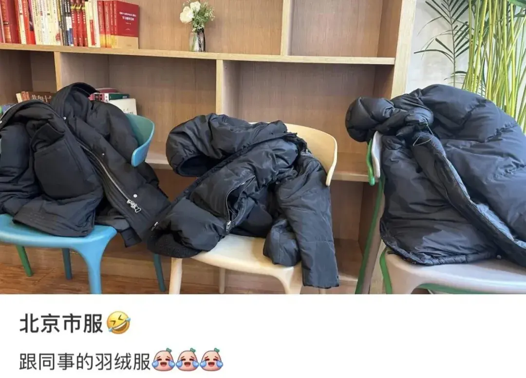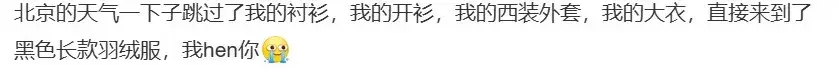 “冬天到了,全体北京人都从衣柜里精挑细选出了一件黑色羽绒服。”