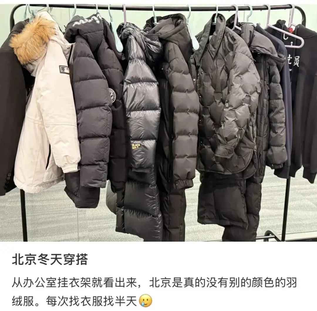 每一位在北京过冬的朋友,只有穿上黑色羽绒服过冬,才能免于被扫射的宿命?”