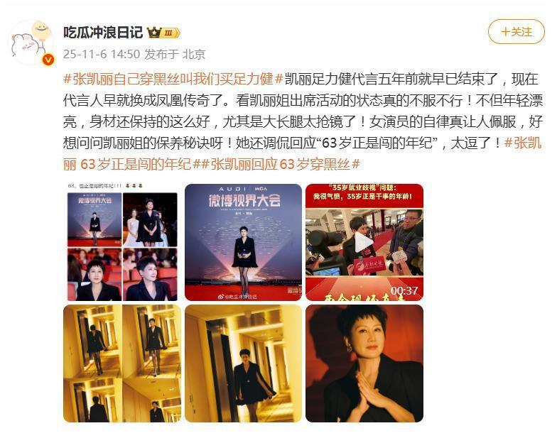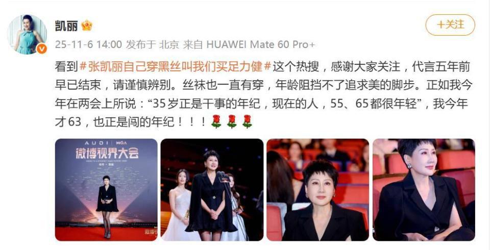面对舆论发酵,张凯丽在次日(11 月 6 日)迅速发微博正面回应,澄清两点关键事实:第一,与足力健的代言合同“已于五年前结束”(约 2020 年),并呼吁公众谨慎辨别信息时效性;第二,明确表态“丝袜也一直有穿”,直接回击对其穿衣风格的指摘。