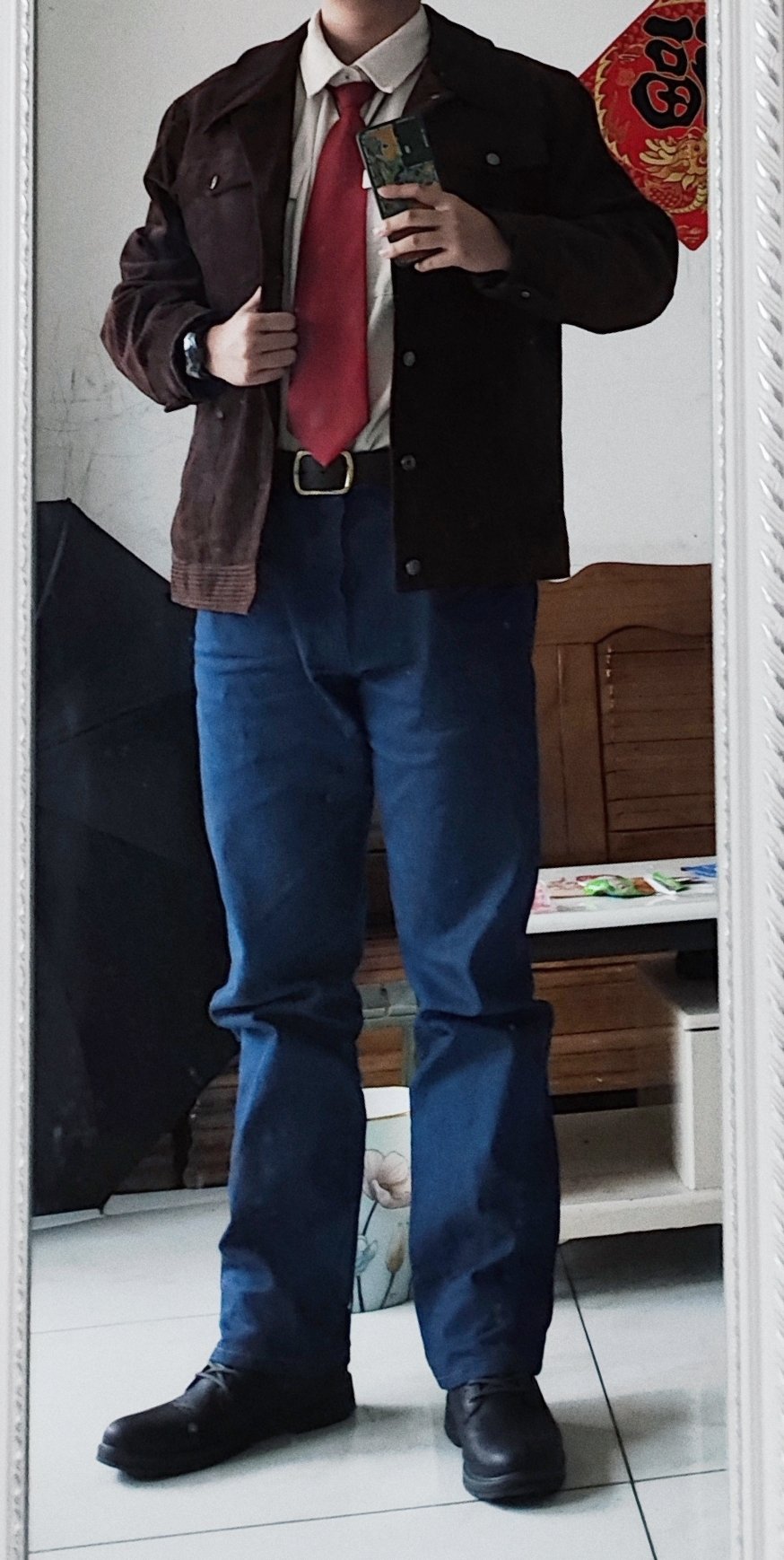 niko身穿一件棕色a2飞行员夹克(ai说的),里面穿着黄白相间的夹克和棕色内衬,裤子是经典蓝白条纹阿迪运动裤,符合niko东欧非法移民的身份。一开始的niko穿着并不体面,圆滚滚的棉衣并不能显示出肩部,看起来十分邋遢,像是流浪汉。但是这件穿搭却是让我最印象深刻的一件套装,衣服上斑驳的泥印和破损也是niko半生颠沛流离的象征。
