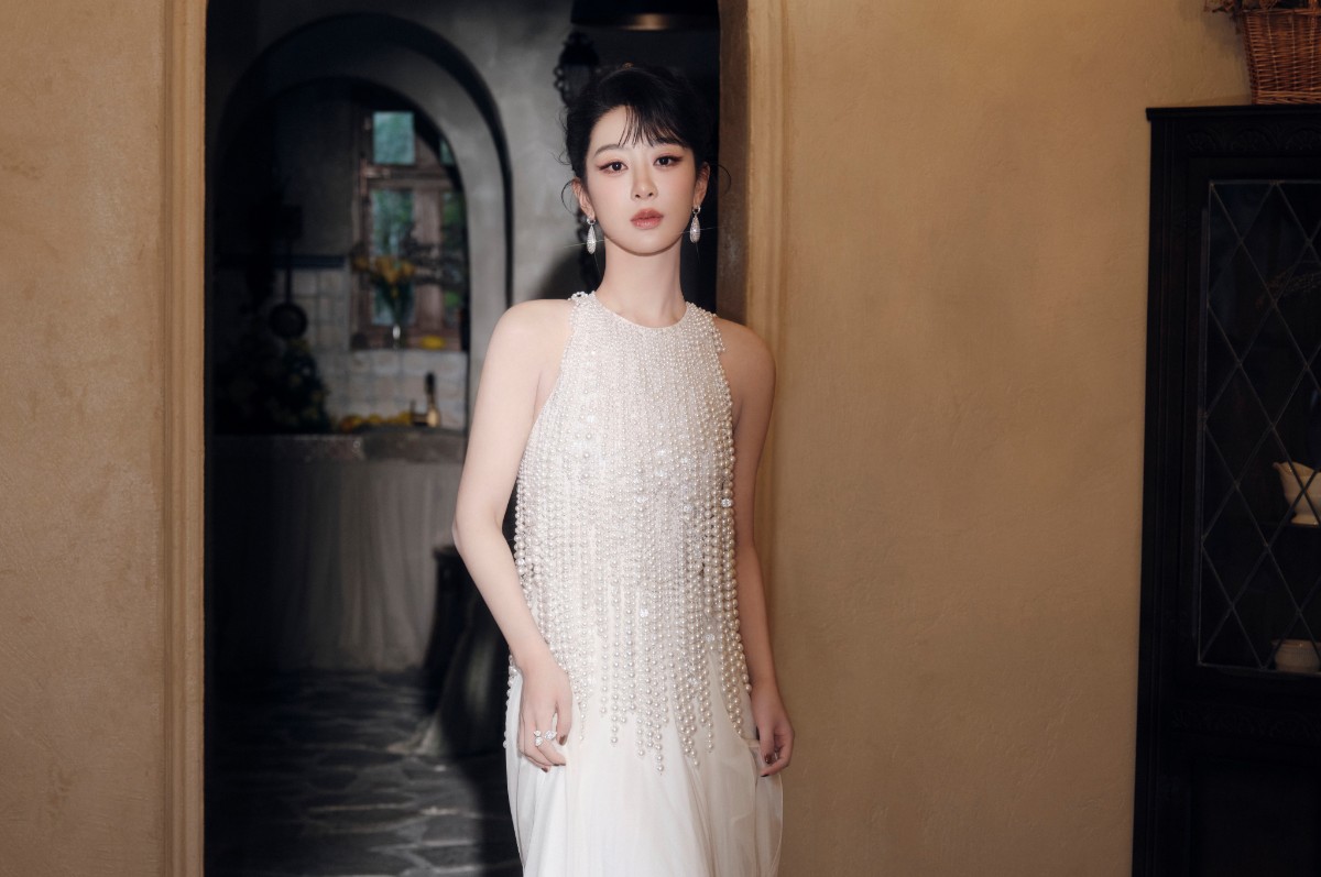 妆容上,她以雾感底妆为基底,眼妆着重刻画眼尾弧度,自然晕染的线条既保留复古韵味,又贴合现代审美;红唇色泽饱满却不张扬,恰如珍珠的柔和光泽。配饰更是点睛之笔:耳畔钻石耳饰如羽翼轻颤,与珍珠发饰形成材质对话;指尖钻饰戒指在举手投足间漾起细碎光芒。每一件配饰都不是孤立存在,而是与礼裙、妆发形成呼应,共同构筑起复古优雅的场域。