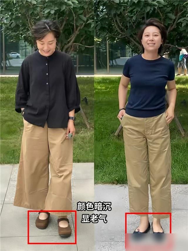 女人老了别穿裙配打底裤和平底鞋,这样穿更好看
