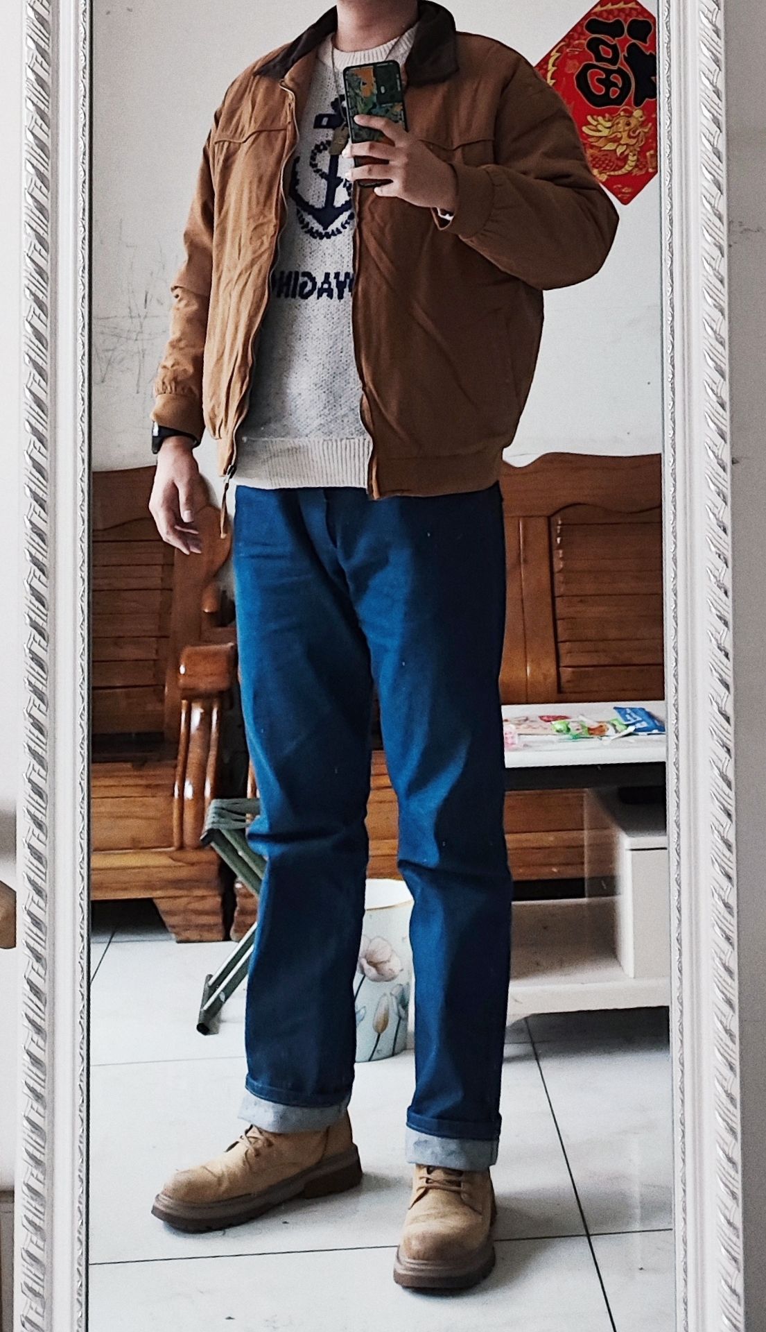 niko身穿一件棕色a2飞行员夹克(ai说的),里面穿着黄白相间的夹克和棕色内衬,裤子是经典蓝白条纹阿迪运动裤,符合niko东欧非法移民的身份。一开始的niko穿着并不体面,圆滚滚的棉衣并不能显示出肩部,看起来十分邋遢,像是流浪汉。但是这件穿搭却是让我最印象深刻的一件套装,衣服上斑驳的泥印和破损也是niko半生颠沛流离的象征。