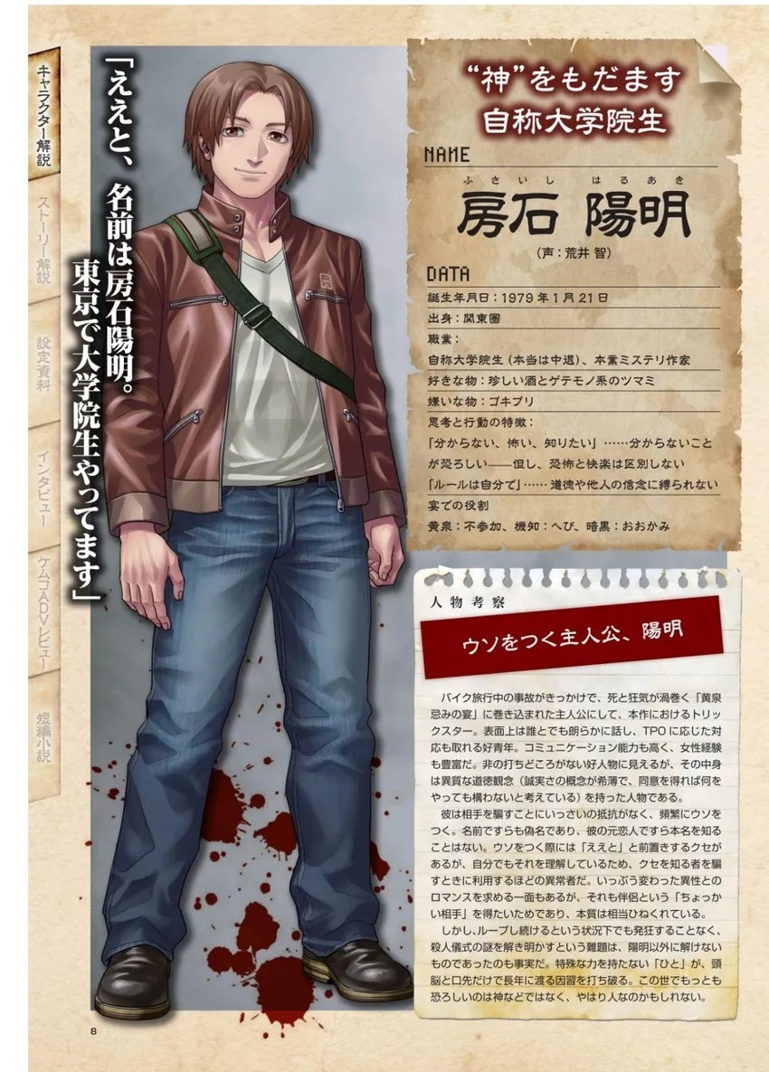 房石阳明,出自游戏《人狼村之谜》。他因巴士事故,意外卷入被死亡狂潮席卷的“黄泉忌之宴”,成为本作的核心人物。他表面开朗,沟通能力强,受女性欢迎,但也有不择手段、利用他人的一面,还肩负着查明杀人模式等难题的任务,有着复杂多面的性格与重要作用。