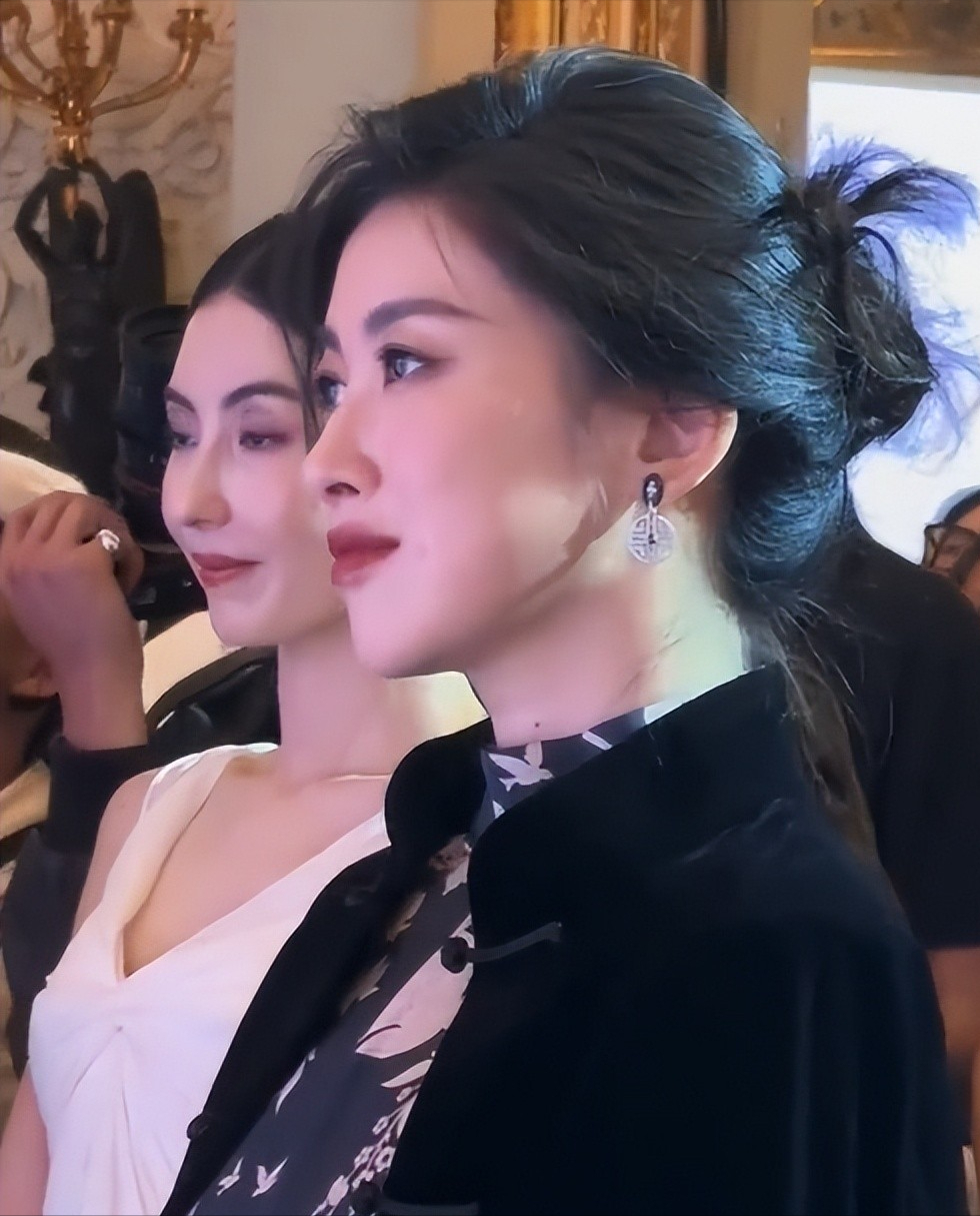 新中式旗袍上身,朱珠立即变得温婉内敛,简单盘发与线条流畅的脸型连成一道弧线。