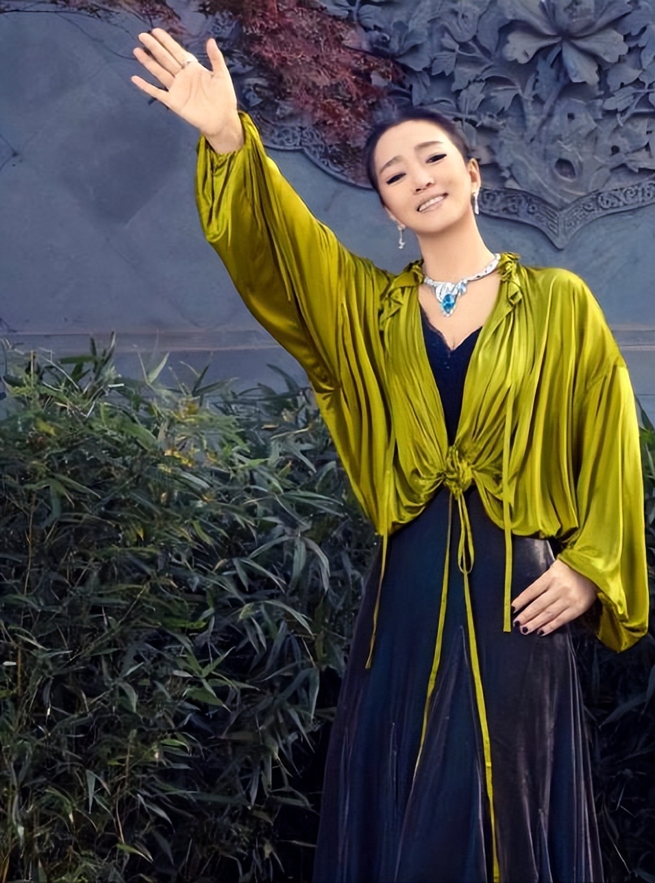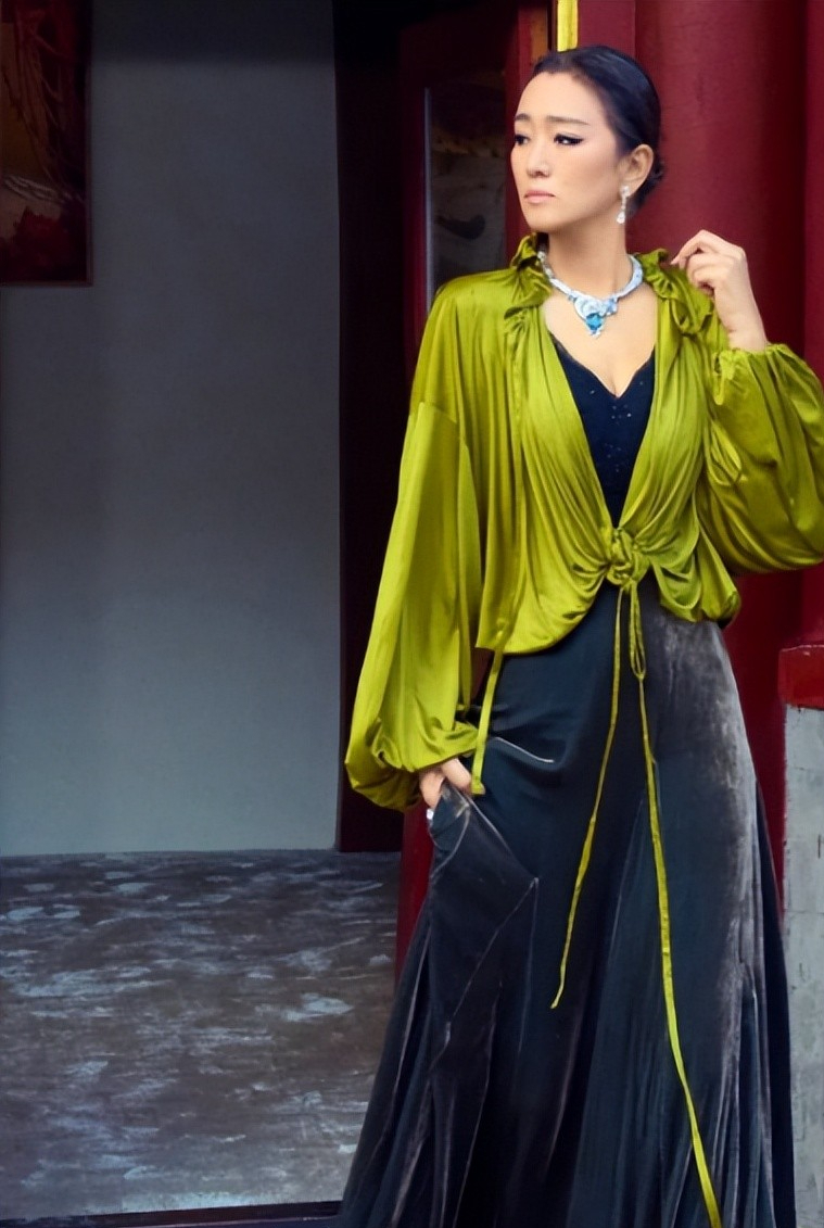 所有人只能穿黑色时,只有巩俐,在黑色丝绒长裙外,套了一件有黄色调的绿色丝绸外衫。