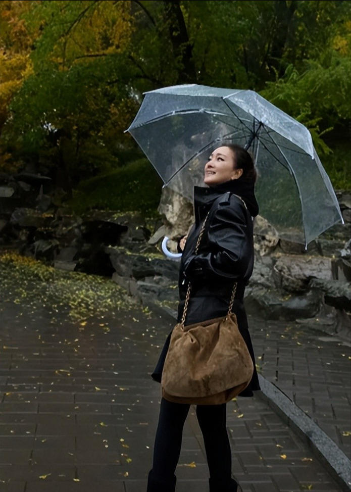 她穿得比较保暖、全身黑色,打着一把透明雨伞,就开始了这趟秋游。