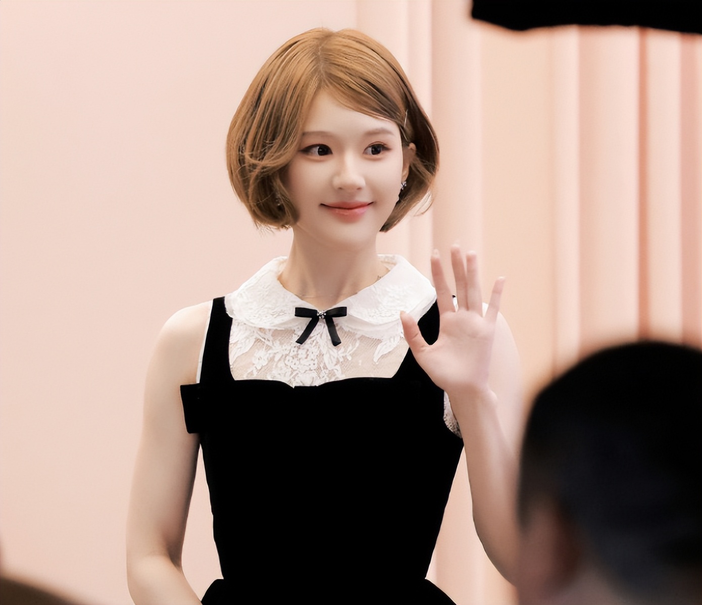同样是娃娃领的设计,赵露思在不同阶段给人的感觉完全不一样。黑色礼服和蕾丝娃娃领的设计组合在一起优雅又精致,金色的短发衬得五官更加精致。