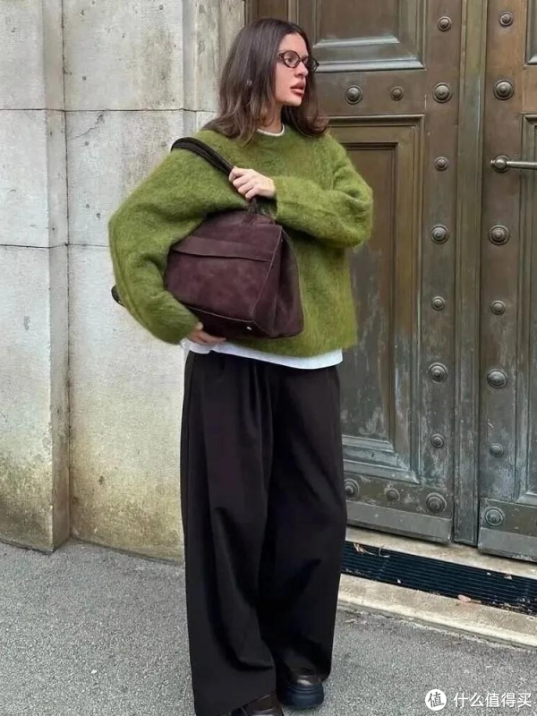 绿色最不会出错的就是搭配各种基础色,时尚又耐看。苔藓绿色的短款毛衣,搭配黑色的高腰阔腿裤,上短下长,自然显高。简约复古又有秋冬氛围感的穿搭。