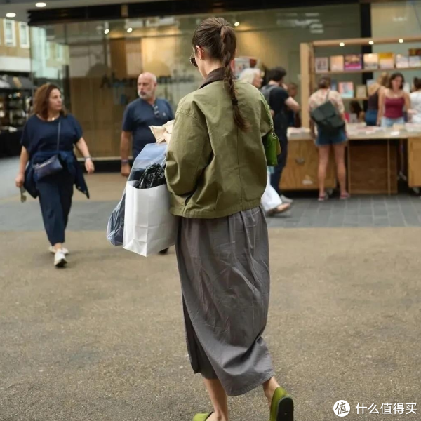 军绿色的短款工装外套,搭配灰色的长裙,短款很适合小个子,提高腰线特别显高。绿色跟灰色的搭配复古干净又特别高级。