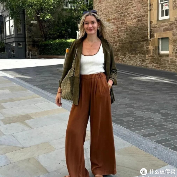 绿色的麂皮绒衬衫外套充满复古氛围,搭配棕色的高腰阔腿裤,内搭白色背心,腰线上移十足地显高,整套穿搭简约松弛,绿色跟棕色的搭配妥妥的秋冬氛围标配,气质十足。