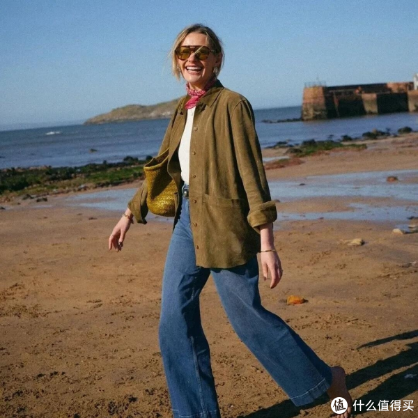 矮个子姐妹穿复古绿色的衬衫外套,搭配蓝色的高腰牛仔阔腿裤,显高又显瘦。绿色跟蓝色的撞色,时尚感拉满,又不失秋冬的氛围感。红色的印花小丝巾点缀搭配,更添时尚趣味。