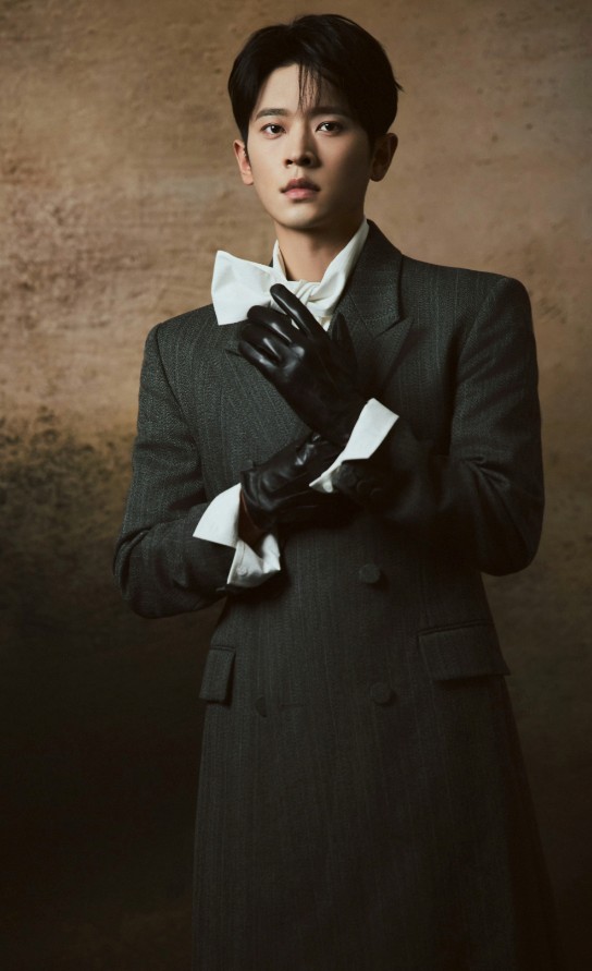 细节里的“反差感”更见巧思:黑色皮质手套裹住修长手腕,冷硬材质和衬衫的柔软面料碰撞出禁欲气质;手插口袋的松弛姿态,又把正装的严肃感揉得恰到好处。背景的做旧肌理墙像一幅复古油画,衬得整套造型既有“旧时代绅士”的矜贵,又带着年轻演员的清冽少年气。