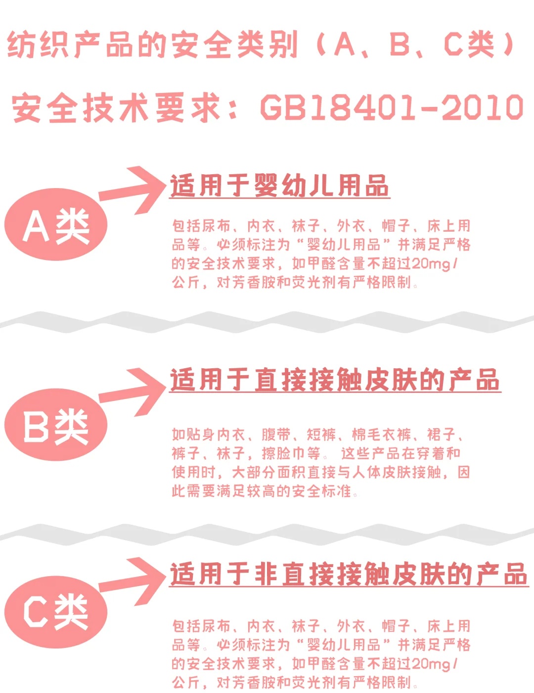 安全类别属于b类的衣服,是可以直接接触皮肤的,而如果标出了c类,则是非直接接触皮肤的衣服。