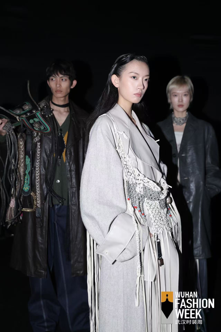 陈宇携手日本设计师有働幸司与Taiga乐队,把锡林郭勒草原的晨雾、马头琴、合成器节拍等转译成可行走的时装音景。设计师采用嘉柯ZAKER植物素皮等可持续材料,将游牧精神的旷野之力转化为流动的当代廓形。大廓型机车夹克、飞行夹克、战壕风衣在流苏与绳结的韵律中实现“Balance”平衡感与“Harmony”和谐感,诠释草原生活中人与万物共生的真实状态。